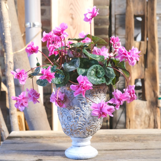 12月16日(火)に、Youtubeでご紹介しました! 【!!鉢は付いていません 苗だけのお届けです!!】 ◾️【No, 10】ミニシクラメン チモシリーズ 八重《 枝垂れざき 》 矢祭園芸さんのチモシリーズ! に、しだれ咲きの品種が登場です。 チモの美しさと丈夫さは、園芸好きさんならもうご存知のことと思いますが、今回ご紹介するのはしだれ咲きなのですよ。 背の高い鉢にさっと植えるだけで、なんともゴージャスな世界が誕生します。 たいへん個体差のある品種ゆえ、あれにもこれにも目を奪われます。 お花のかたちや大きさ、色が異なります。色は単色のものもあればグラデージョンがかっているものも。そして葉の色合いやかたち、大きさも違うのです。 ピン!ときたものがあれば、ぜひおうちに迎えてあげてくださいね。 【矢祭園芸】50年の歴史!シクラメン育種の最新情報 https://www.youtube.com/watch?v=WnmsMVCq-OI 矢祭園芸さんで50年かけて完成したシクラメンが到着しました! チモシリーズは寒さにとても強い品種です。 【!!鉢は付いていません 苗だけのお届けです!!】 ◾️【No, 10】ミニシクラメン チモシリーズ 八重《 枝垂れざき 》 4号鉢(直径 12 cm) ・科属名 :サクラソウ科シクラメン属 ・タイプ :半耐寒性多年草 ・草丈 :15〜30cm ・開花 :10〜4月※環境による ・耐寒性 :強い ・耐暑性 :普通 ・日照 :日なた、水はけ良く 【お願い】 お花の付き方の特性上、輸送にとても弱い品種です。もちろん厳重に梱包してお送りいたしますが、一般の苗と比較してお花が傷つく可能性がありますことをあらかじめご理解いただけましたら幸いです。 ◼️寒さに強い「チモ」シリーズ 「チモ」は、矢祭園芸 金澤氏のミニシクラメンと、岩手県の故・橋本昌幸氏(育種家)のミニシクラメンを掛け合わせて誕生しました。掛け合わせに使用したミニシクラメンの片方は、厳冬期にマイナス15度もの寒さとなる岩手県の環境下で、温室の故障をも乗り越えて生き残った苗であり、結果、とても寒さに強い品種が誕生することとなりました。 矢祭園芸について 福島県矢祭町で40年以上経営する花の生産者さんです。経営者であり育種家である金澤美浩によるオリジナル品種は数多く、特にシクラメンやカーネーション、プリムラ等の品種改良は業界でも非常に有名です。その手による生産品は農林水産大臣賞をはじめ、様々な賞を受賞する圧倒的な品質と独創性を誇ります。 2024年 あなたの知らないシクラメンの世界① https://www.youtube.com/watch?v=tx74eebxWXo&t=1639s あなたの知らないシクラメンの世界② https://www.youtube.com/watch?v=EbS20P7Pl6s&t=2909s 【以下、ご確認ください】 ★お花の咲き進み具合には個体差があります。お届け時にお花が落ちている可能性もあります。いずれも健常な苗ですが、運送中のストレスで花を落とすこともあります。 ★咲き終えた箇所がある場合、その部分をカットして出荷いたします。悪いところを切り落としたわけではなく、次の花芽をスムーズに育てるための作業ですので、あらかじめご了承くださいませ。 ★お届けする商品のお花が、掲載した商品写真より少ない場合があります。 ★植物はそれぞれ個体差があるので、お花がまだ少なかったり咲いていない株が届く場合があります。週の新鮮で旬のお花をご紹介しているので、これから大切に育てて株いっぱいのお花を咲かせてください。