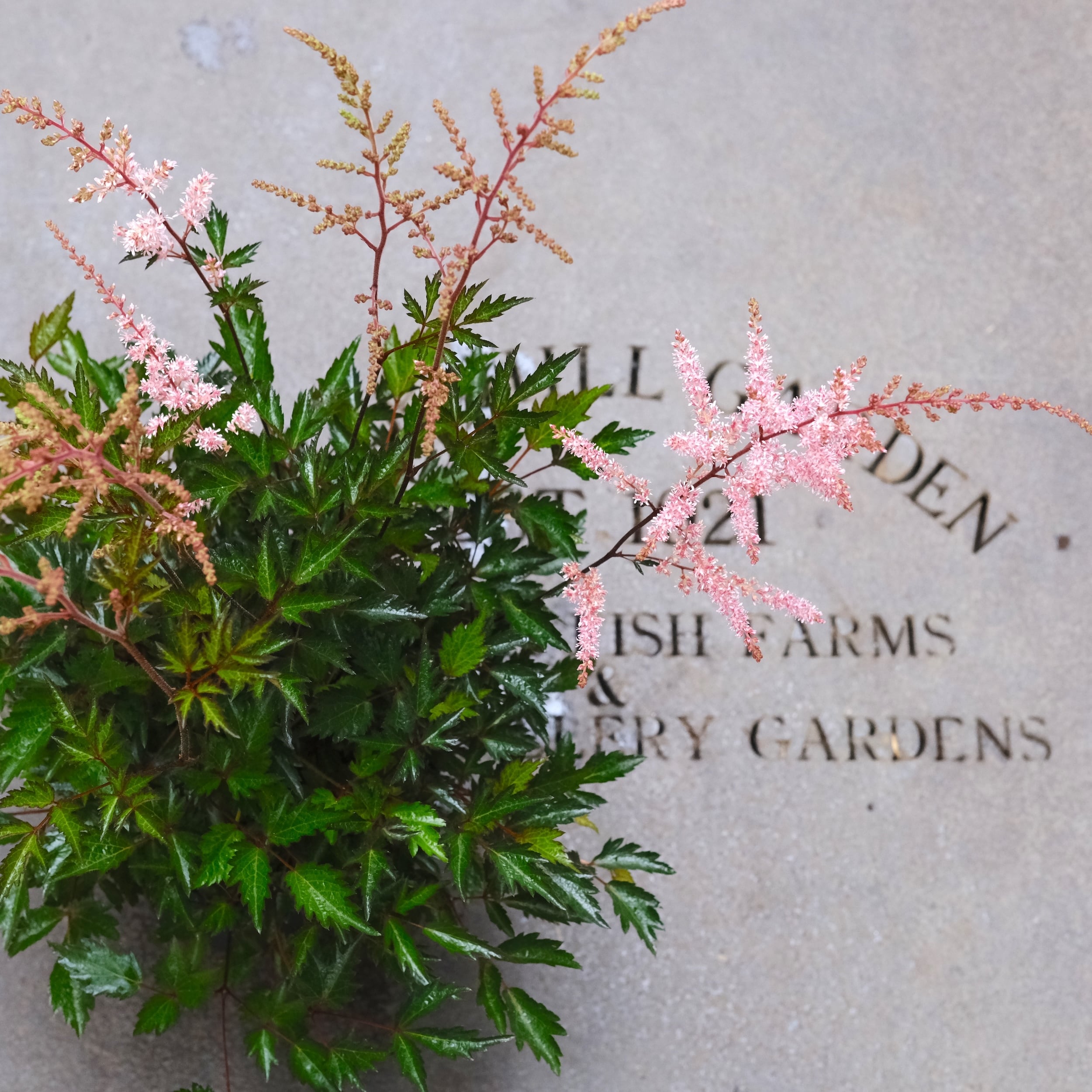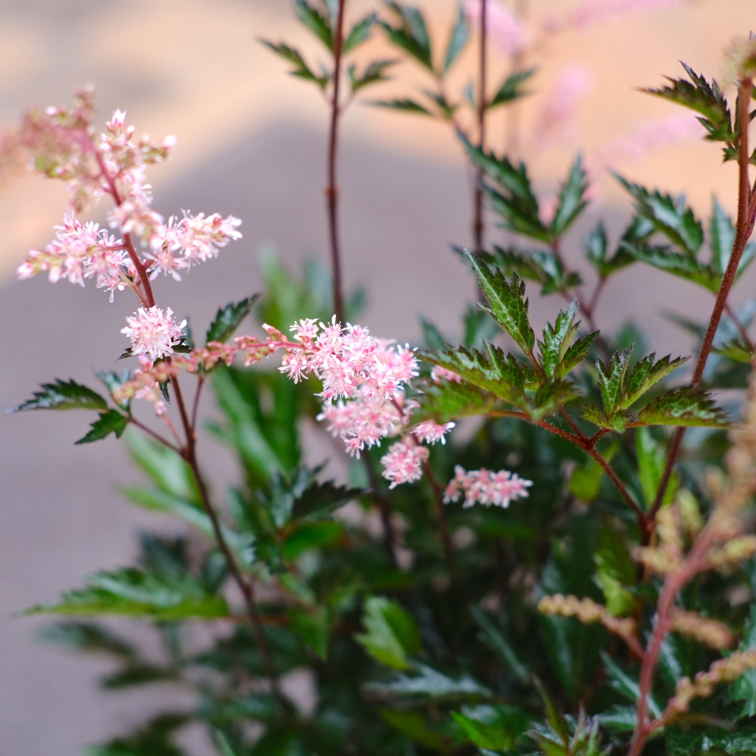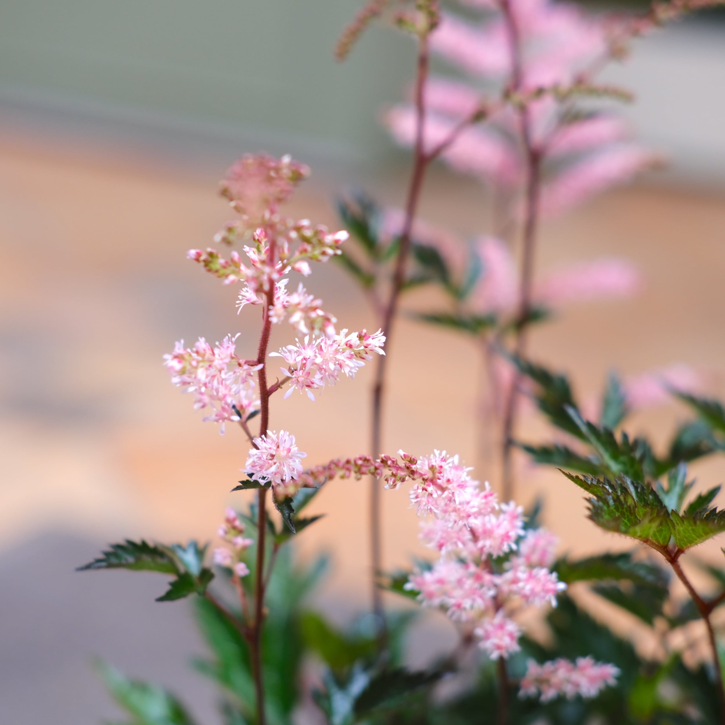 美しい夏の風景にぴったりです。ふわふわとしたピンクの花が綿菓子のように咲き、濃いバーガンディ色の葉が重なり合い、そのコントラストは息をのむほどです。アスチルベは日陰や湿った土壌でもよく育つので、他の植物では育てにくい空間にもぴったりの植物です。アスチルベ「プリティ・イン・ピンク」は、とても丈夫で生育旺盛な多年草です。年々、葉をよく茂らせて見事な花を咲かせます。ギボウシなどの爽やかな緑の葉物植物と組み合わせたり、ベゴニアなどの日陰に強い花を咲かせる植物と組み合わせるとより美しく見えます。