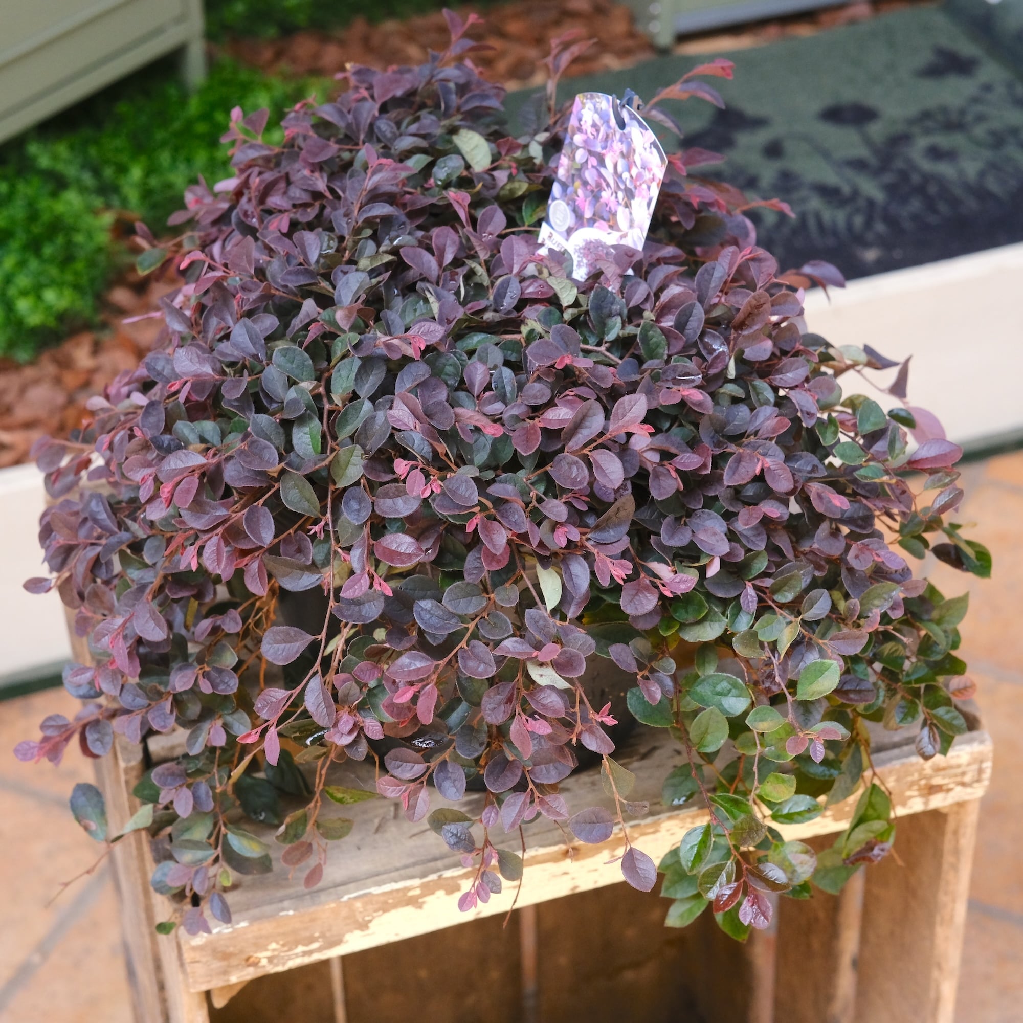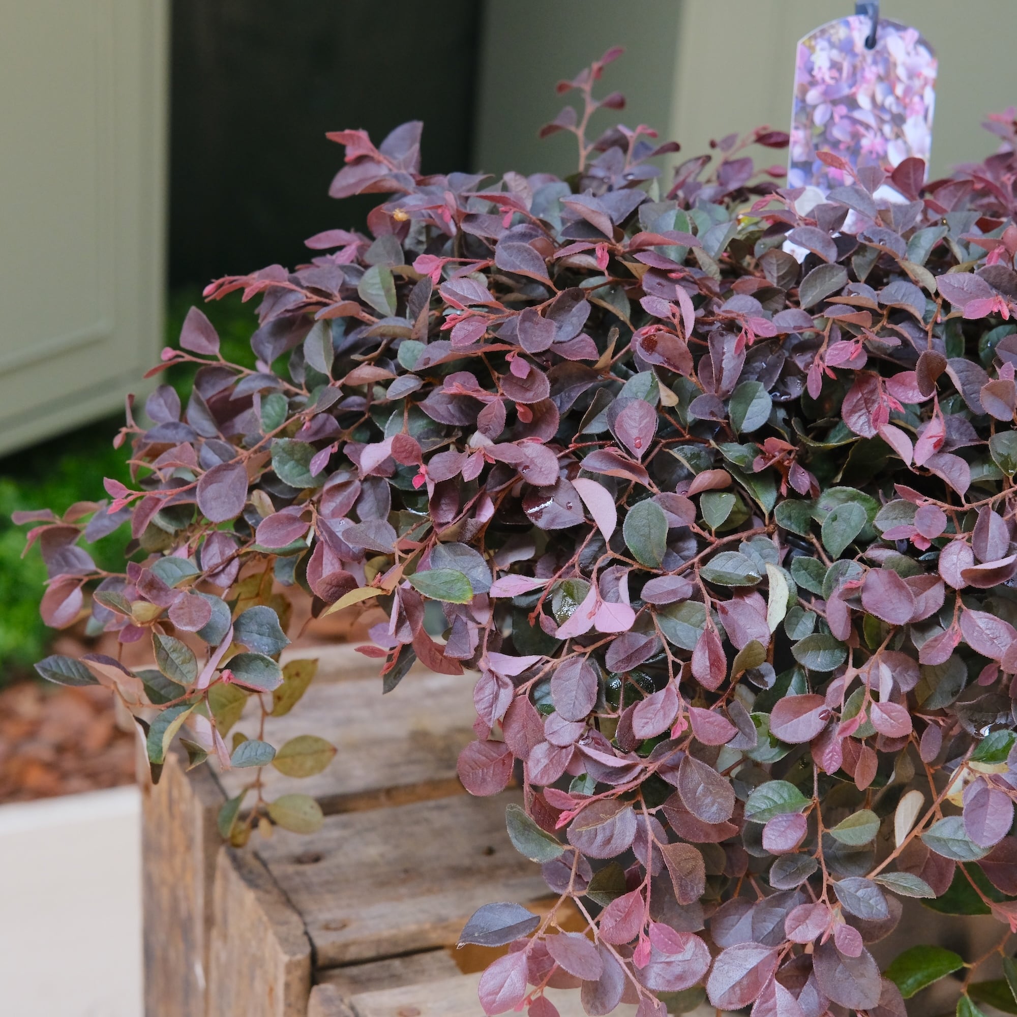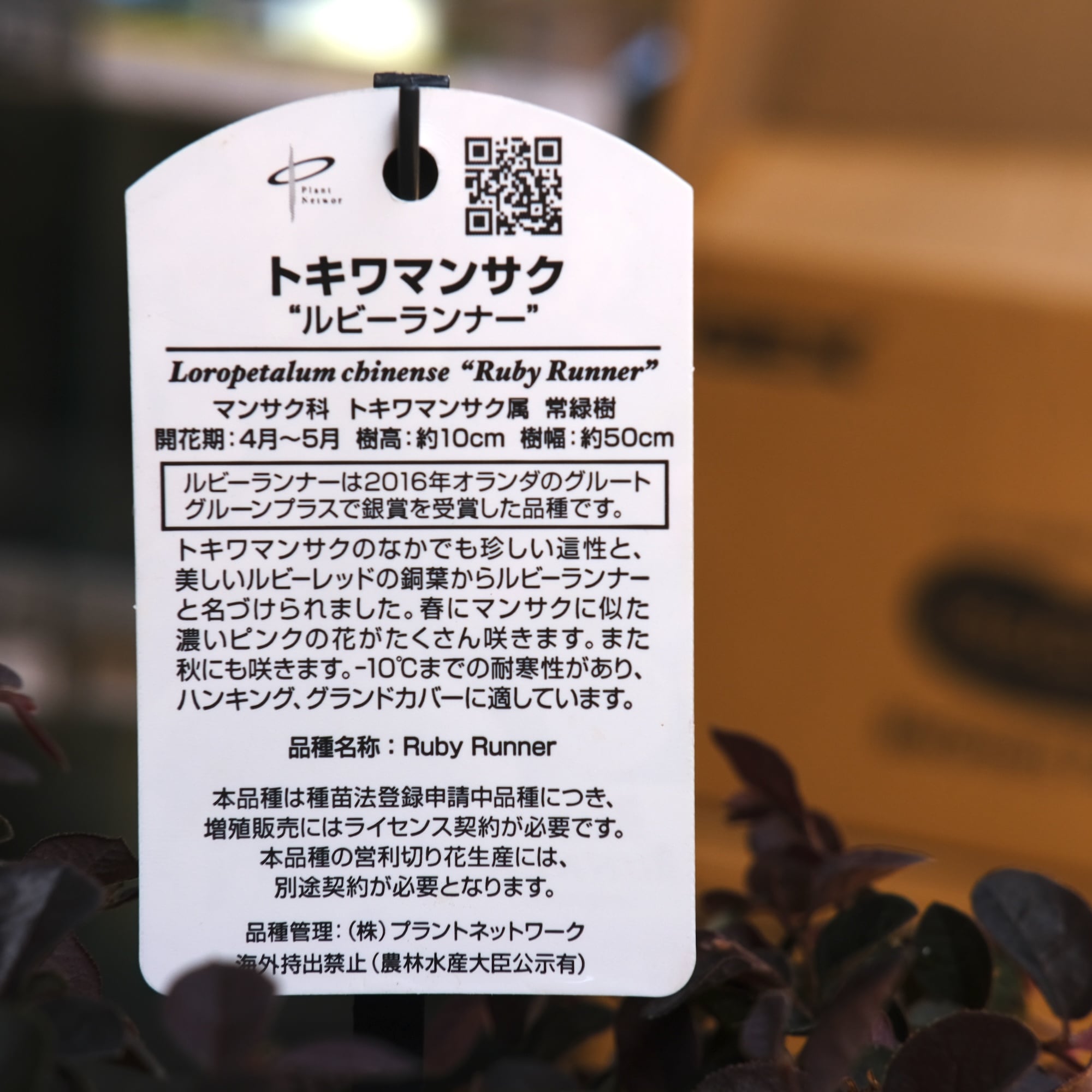 たいへん美しい銅葉色のトキワマンサクです。春にはトキワマンサクとよく似た濃いピンクの花がたくさん咲き華やかになります。環境によりますが、秋にも咲きます。-10°Cまでの耐寒性があり、ハンキング、グランドカバーに適しています。