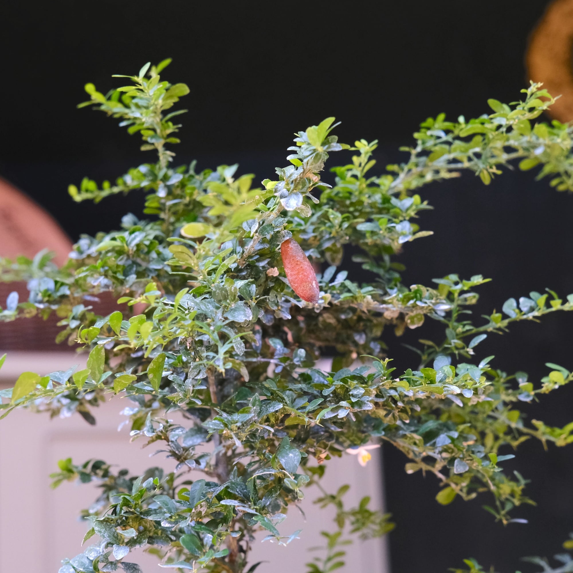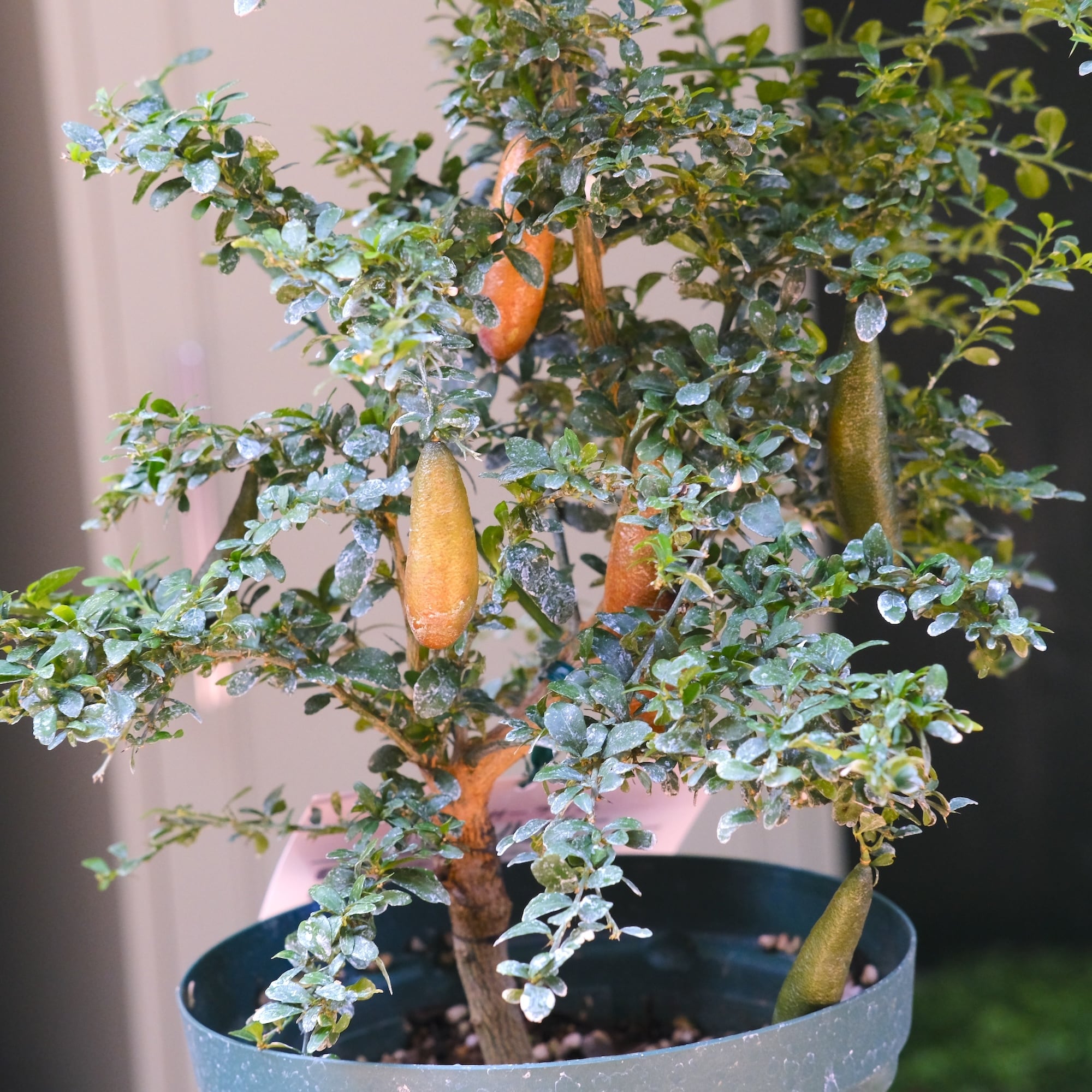 フィンガーライムは、赤い宝石のような果肉がキャビアのように弾ける、オーストラリア原産の珍しい柑橘。爽やかな酸味でデザートやドリンクに華を添えます。小さな鉢でも育てやすい常緑低木です。