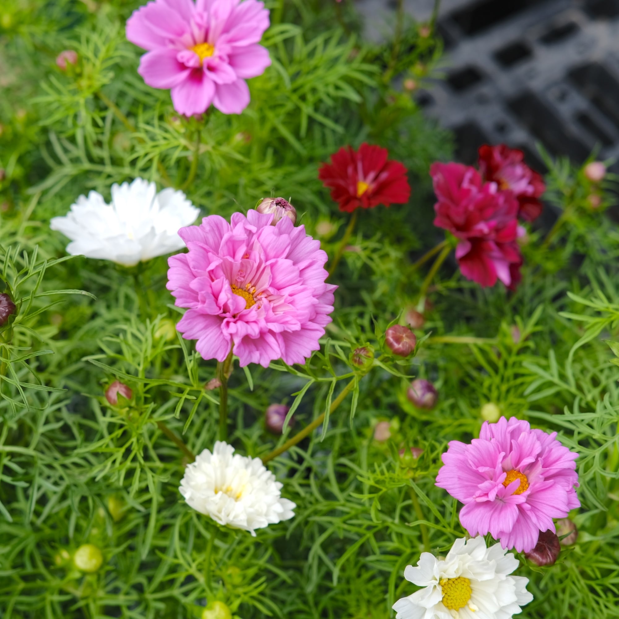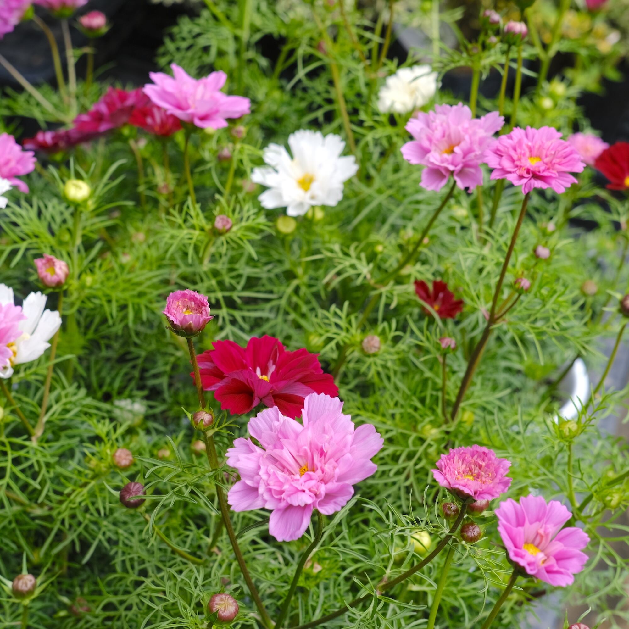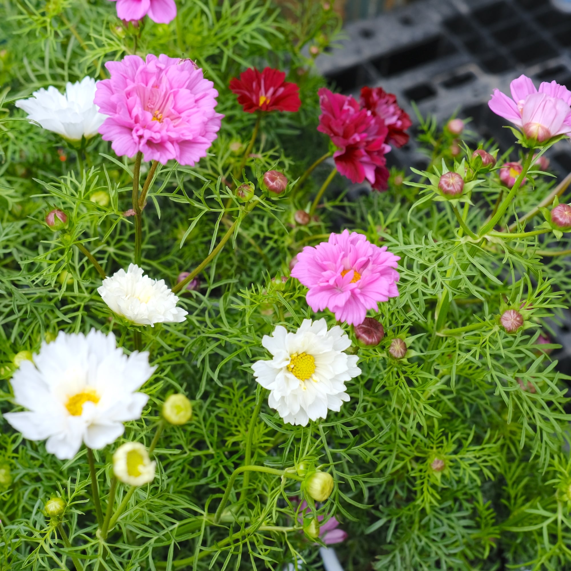 ひとつの鉢に幾つかの種が育って花をつけるので、白とピンクと...など、多色の苗なんです。しかも八重咲きのダブルクリックなので、寄せ植えしなくても華やかな仕上てです。4号鉢のロングで育っているのでしっかりと育っています。切り花にも大活躍です!