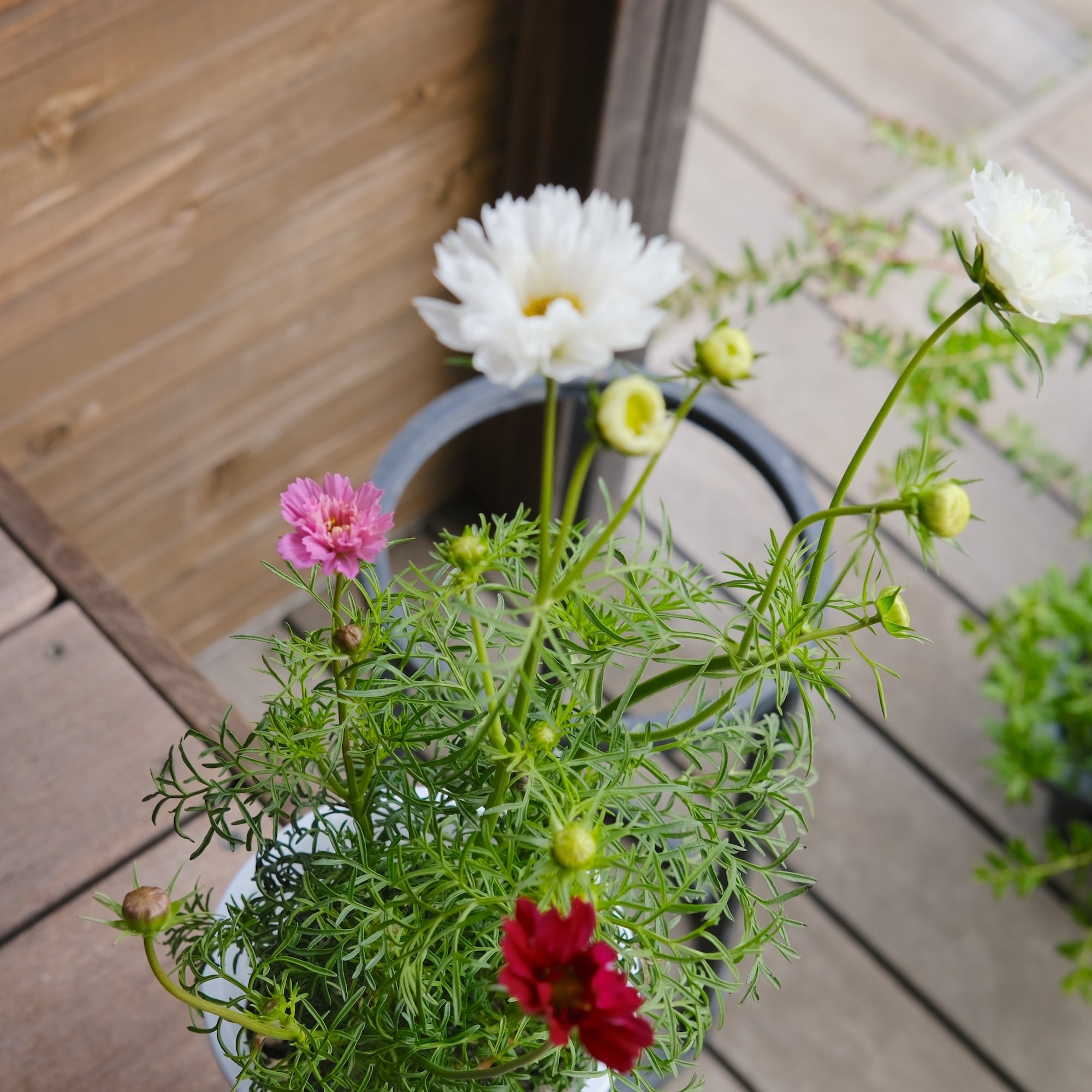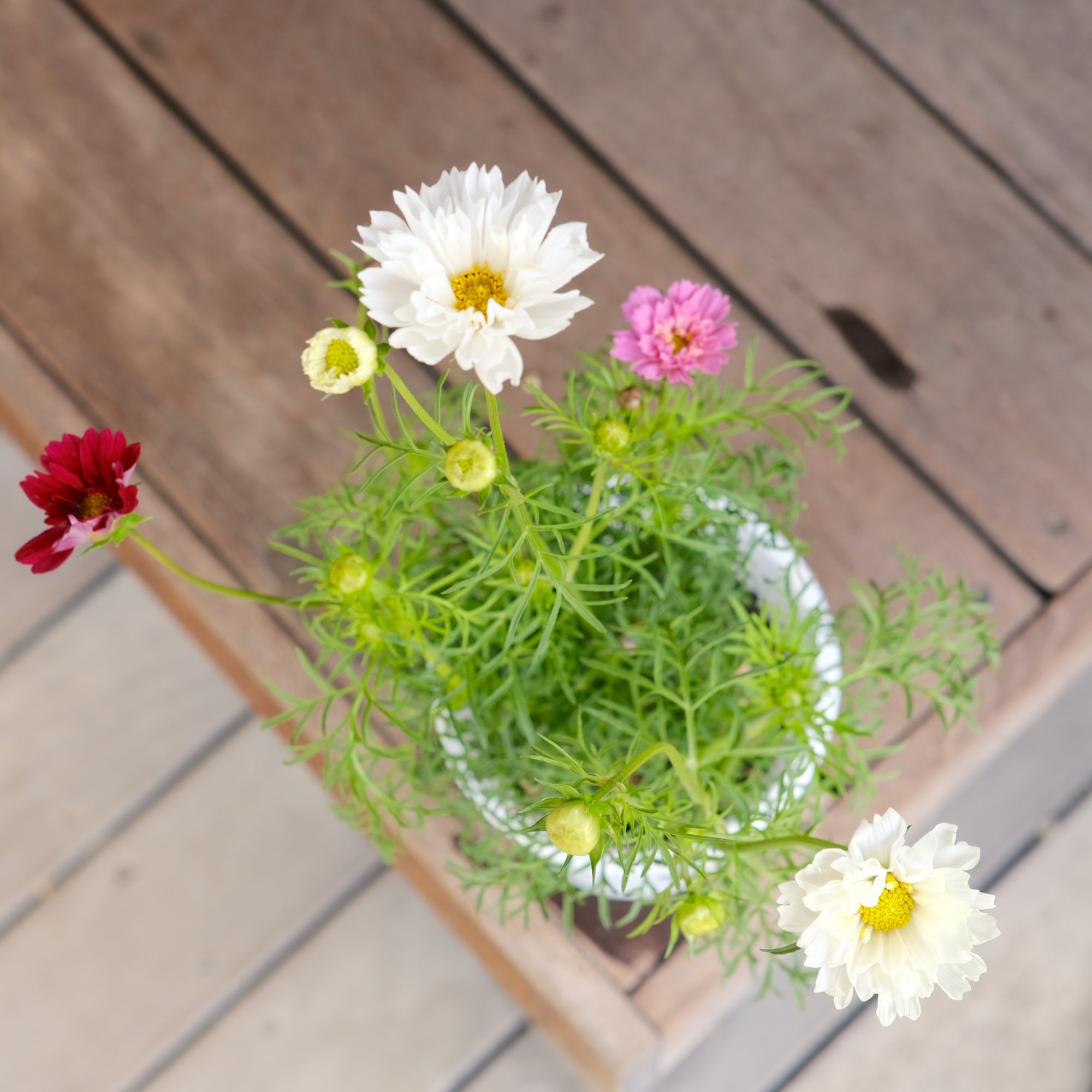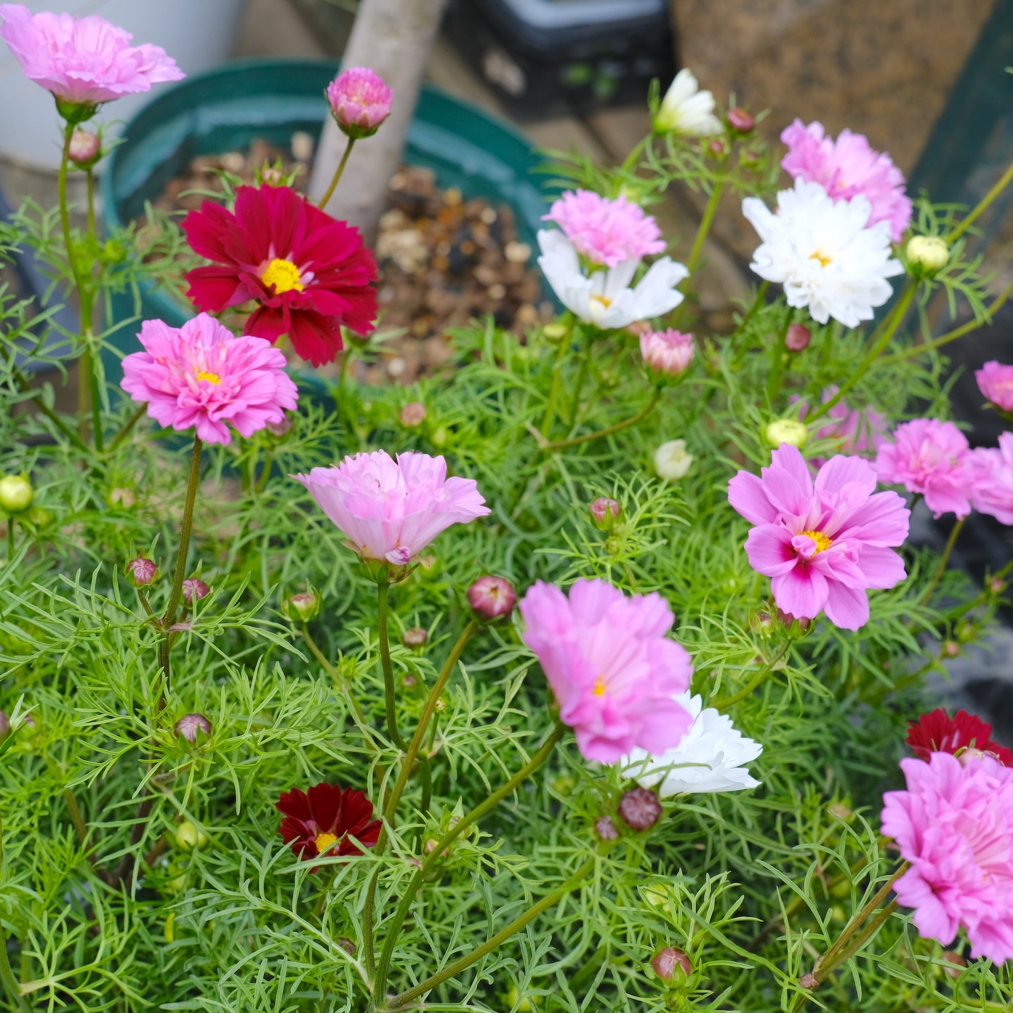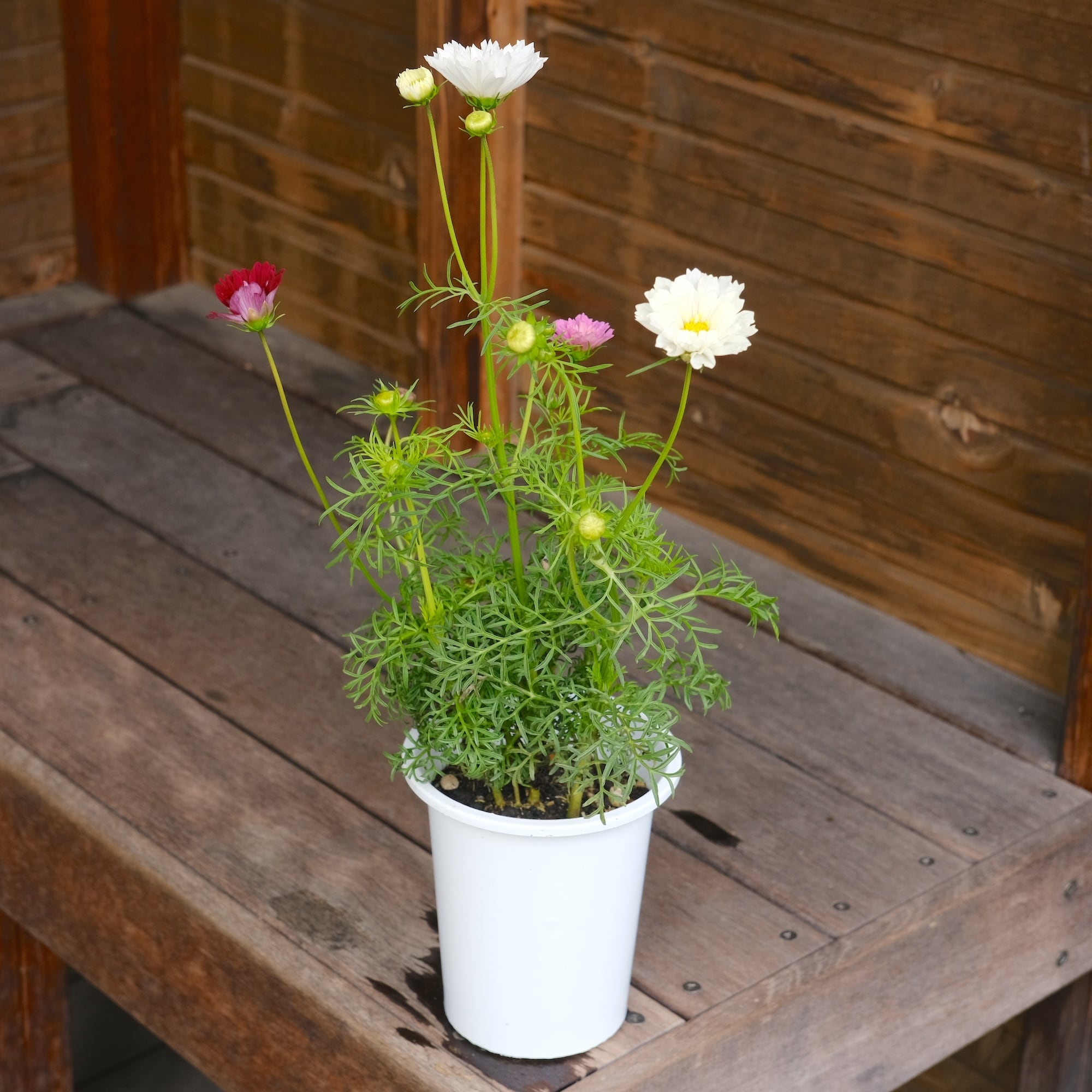 ひとつの鉢に幾つかの種が育って花をつけるので、白とピンクと...など、多色の苗なんです。しかも八重咲きのダブルクリックなので、寄せ植えしなくても華やかな仕上てです。4号鉢のロングで育っているのでしっかりと育っています。切り花にも大活躍です!