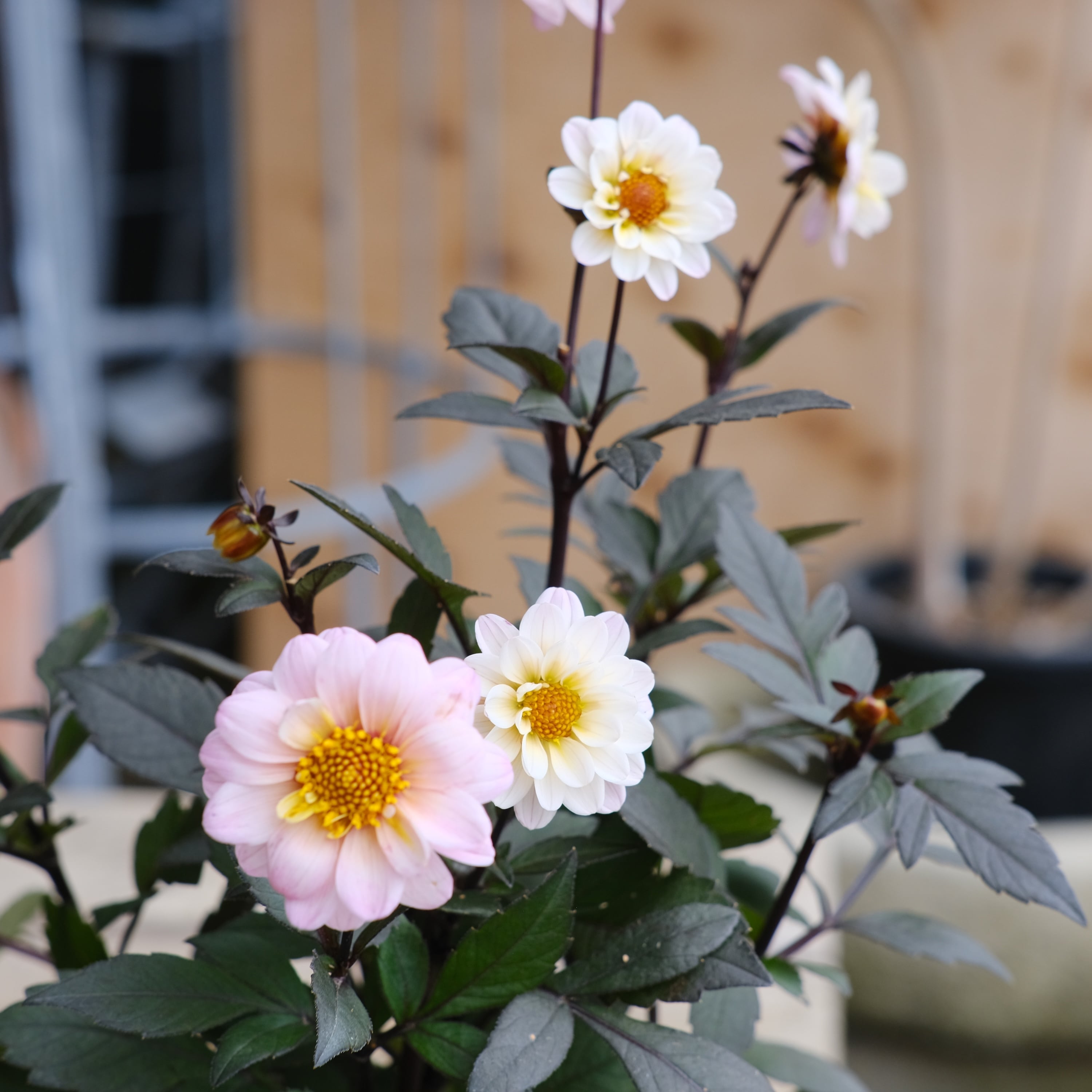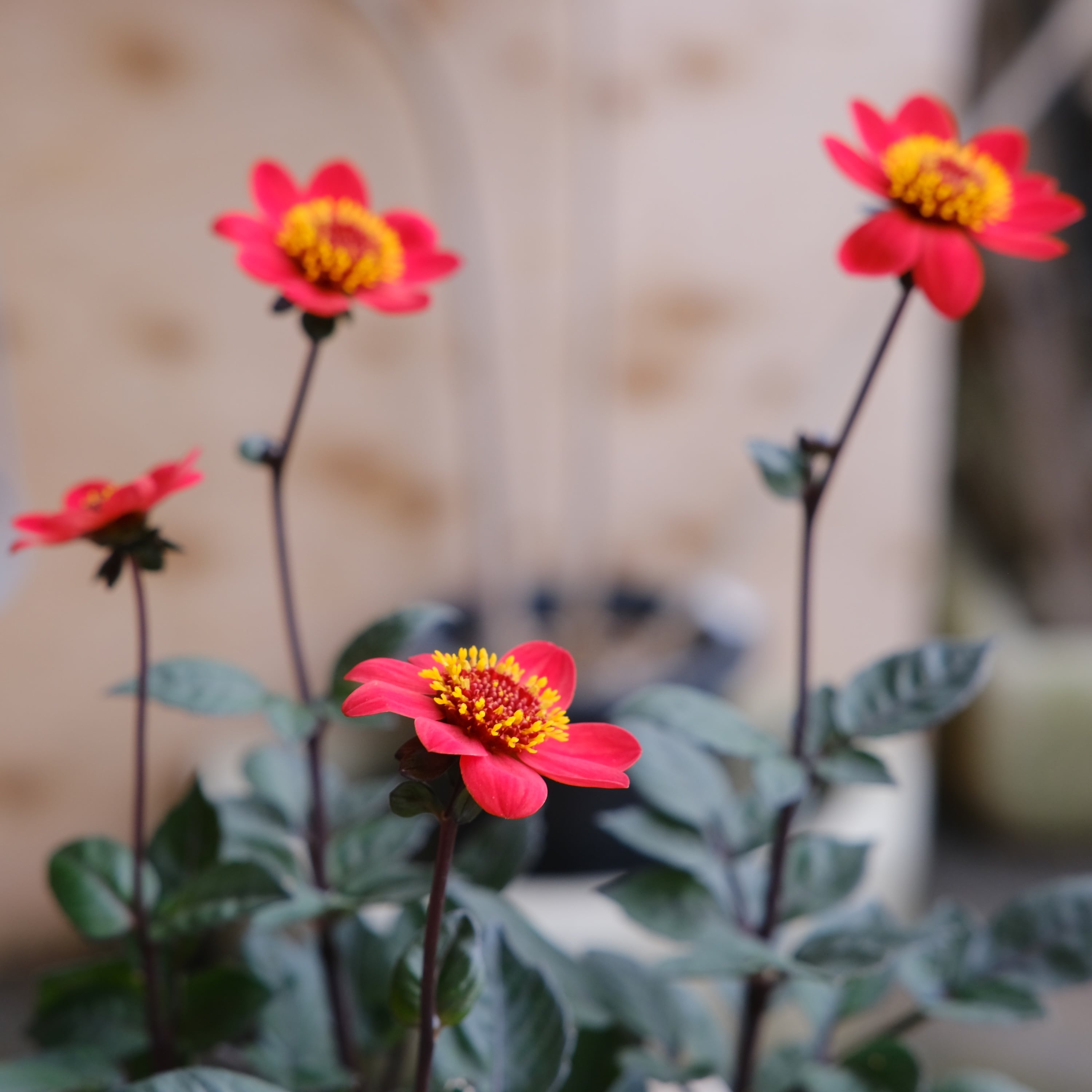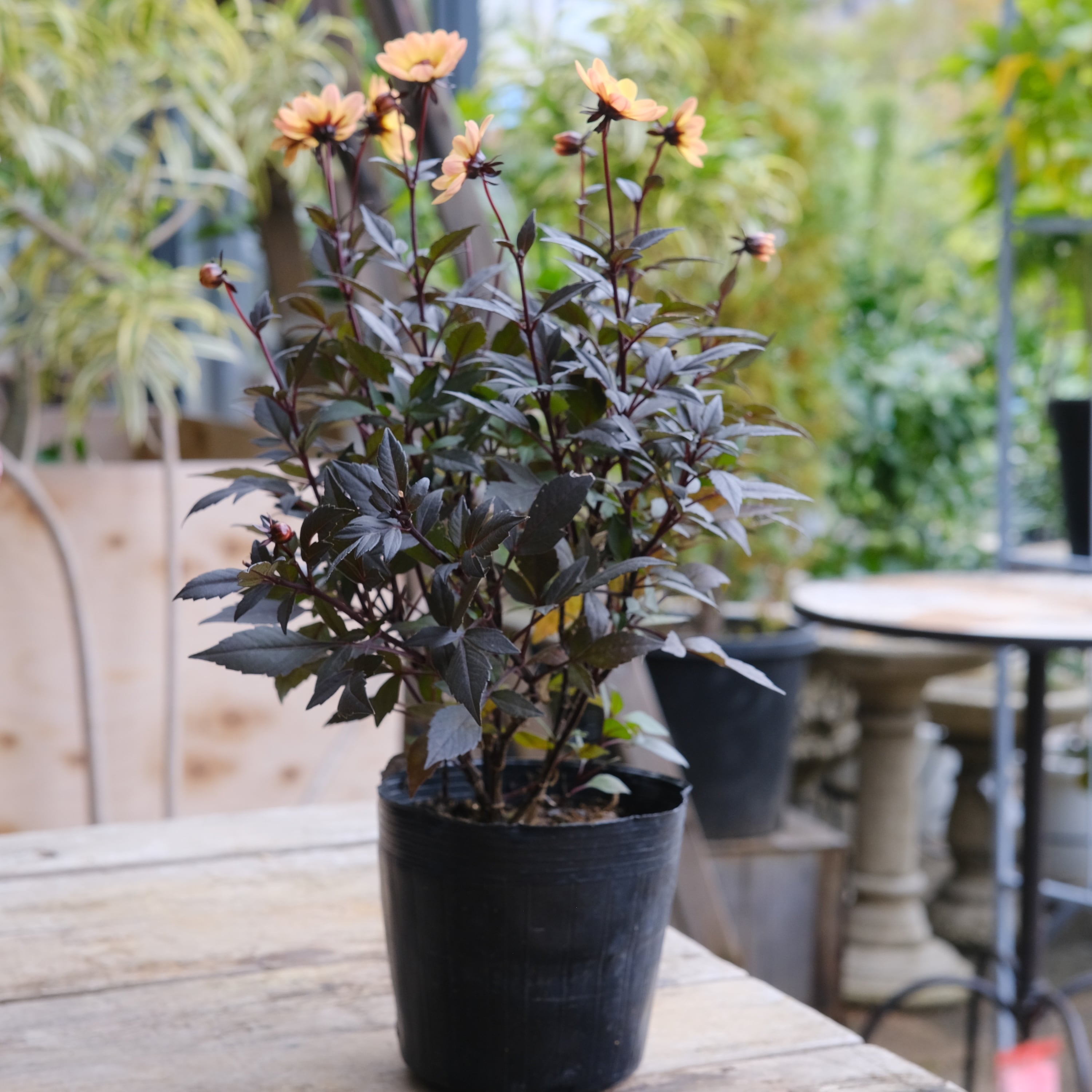 大人気の銅葉ダリアです。葉もお花も小さめの多花性なので主張しすぎずに庭に馴染んでくれるとても優秀な品種です。草丈が伸びすぎず、株のまとまりも良いので庭植えはもちろん、鉢植えにも向いているので寄せ植え材料にもおすすめです。