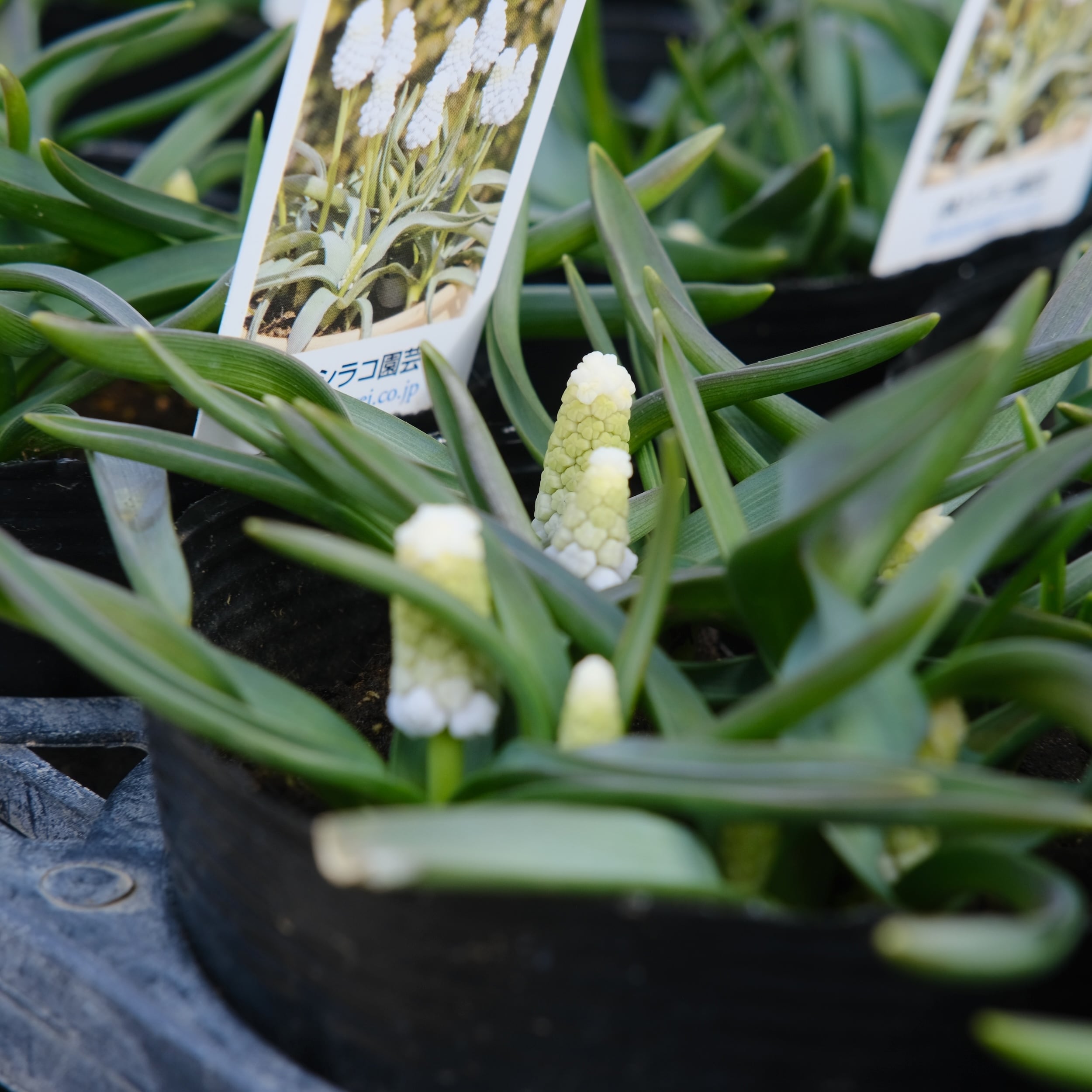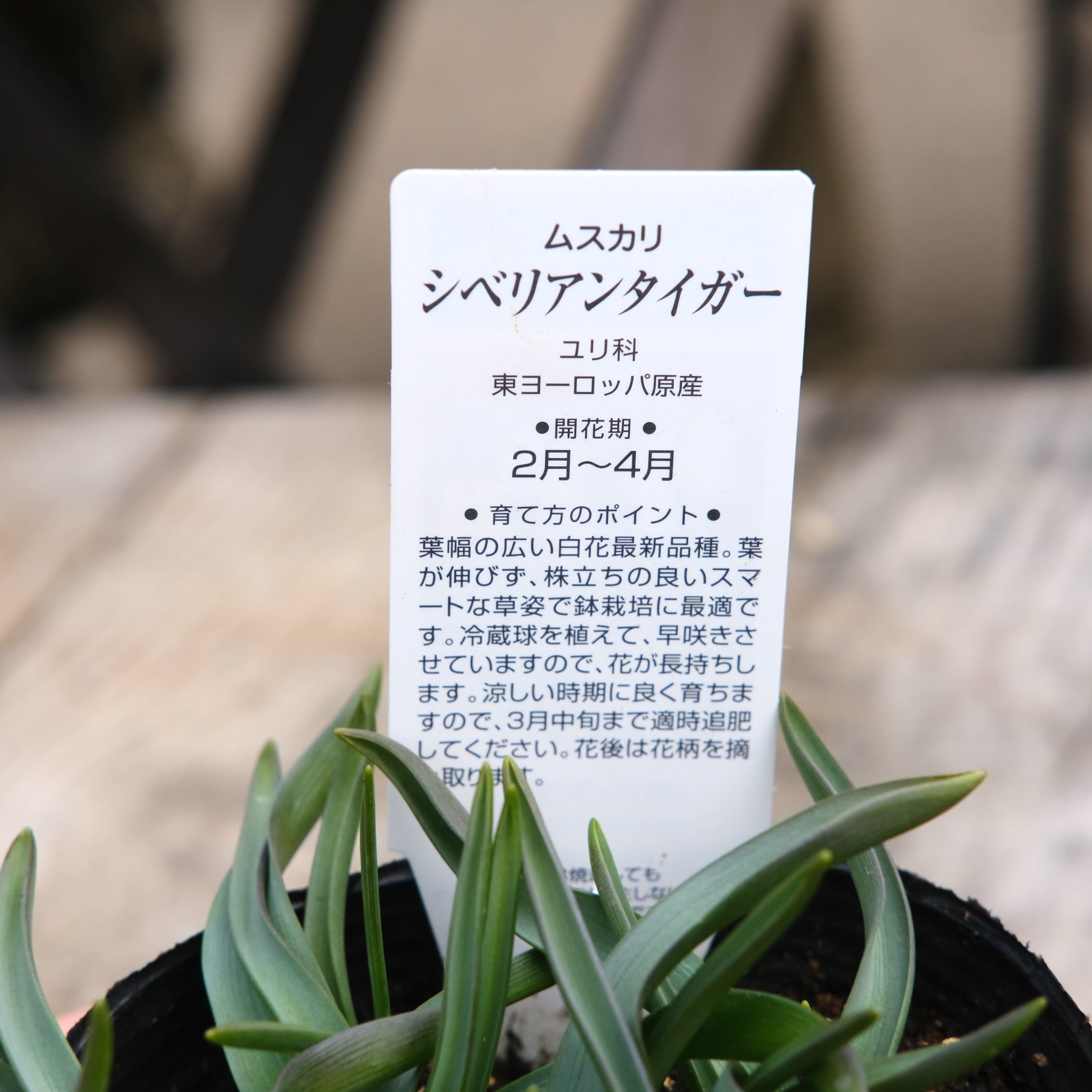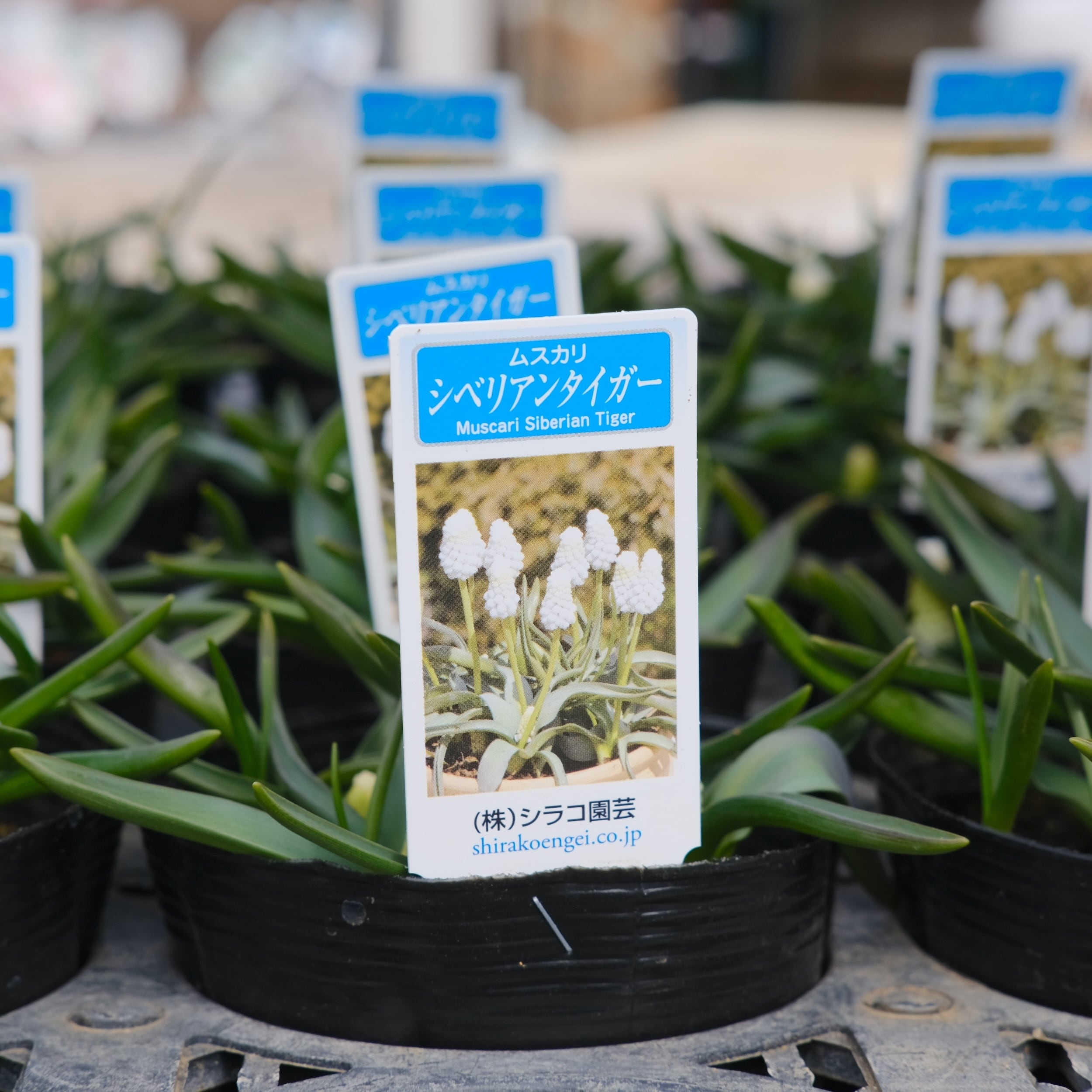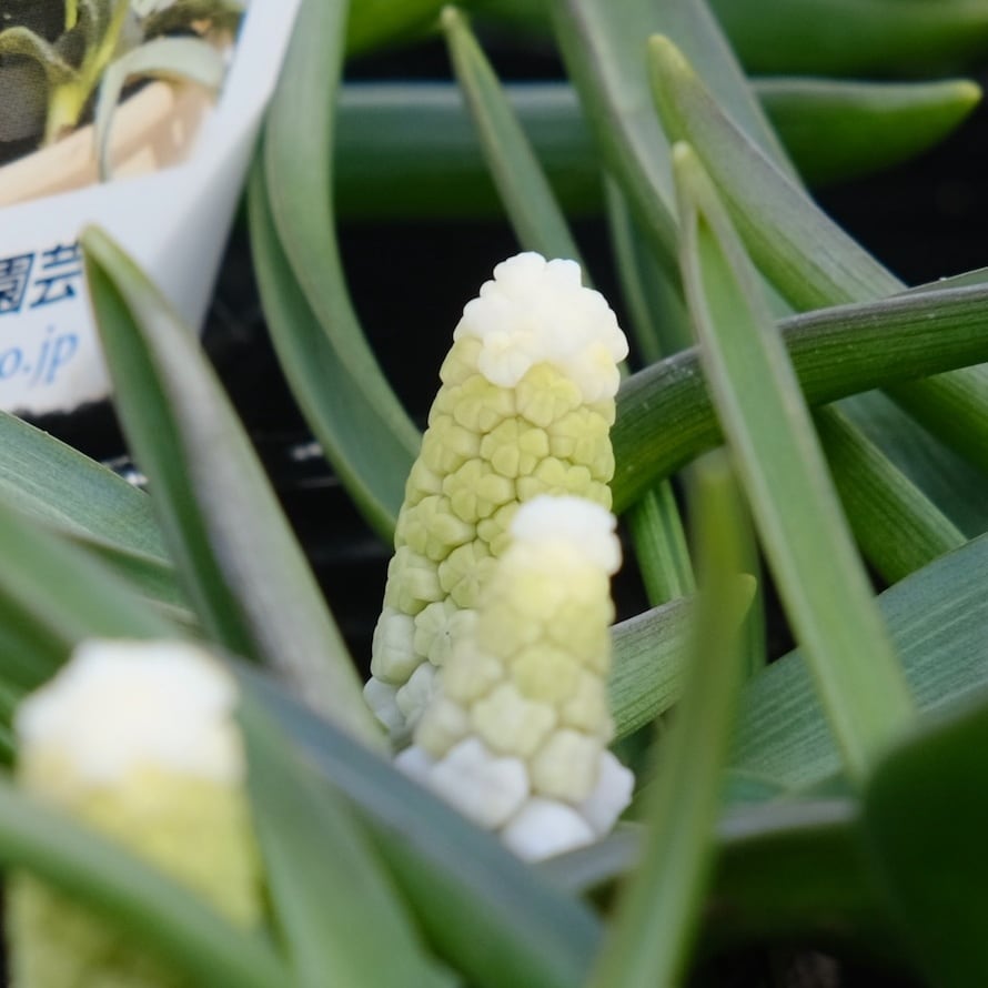 シベリアンタイガーは、淡いブルーを含んだホワイト系ムスカリ。 一般的な白系のムスカリに比べて花穂が大きく、ギュッと詰まって咲くため、非常にボリューム感があります。葉幅の広く、葉が伸びず、株立ちの良いスマートな草姿で鉢栽培に最適です。涼しい時期に良く育ちますので、3月中旬まで追肥してください。花後は花柄を摘取ります。