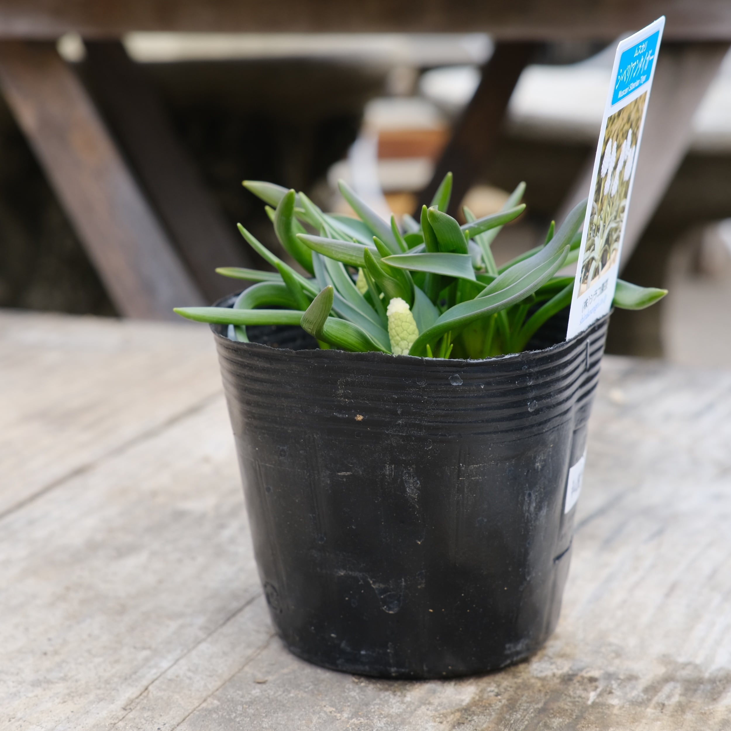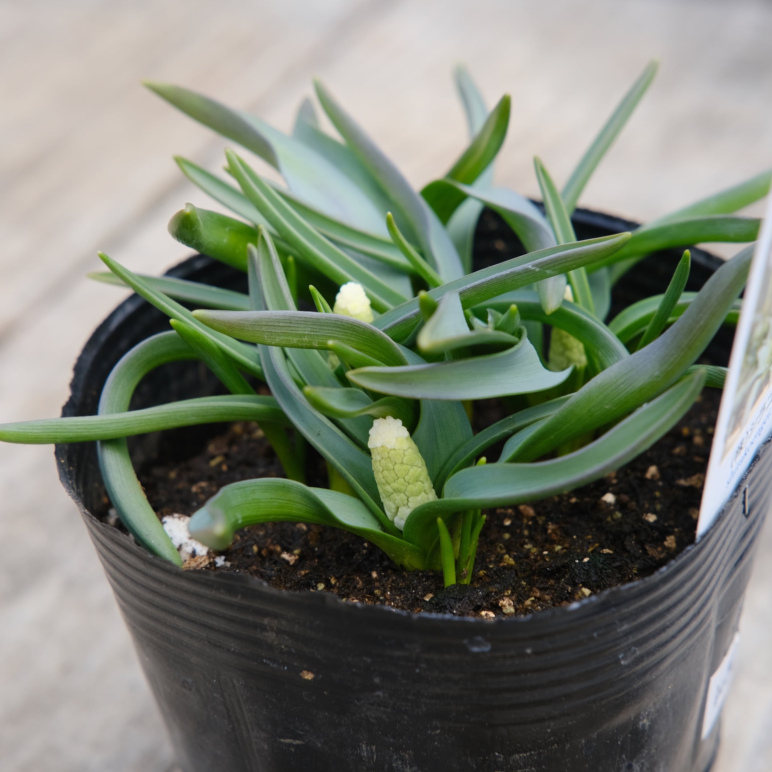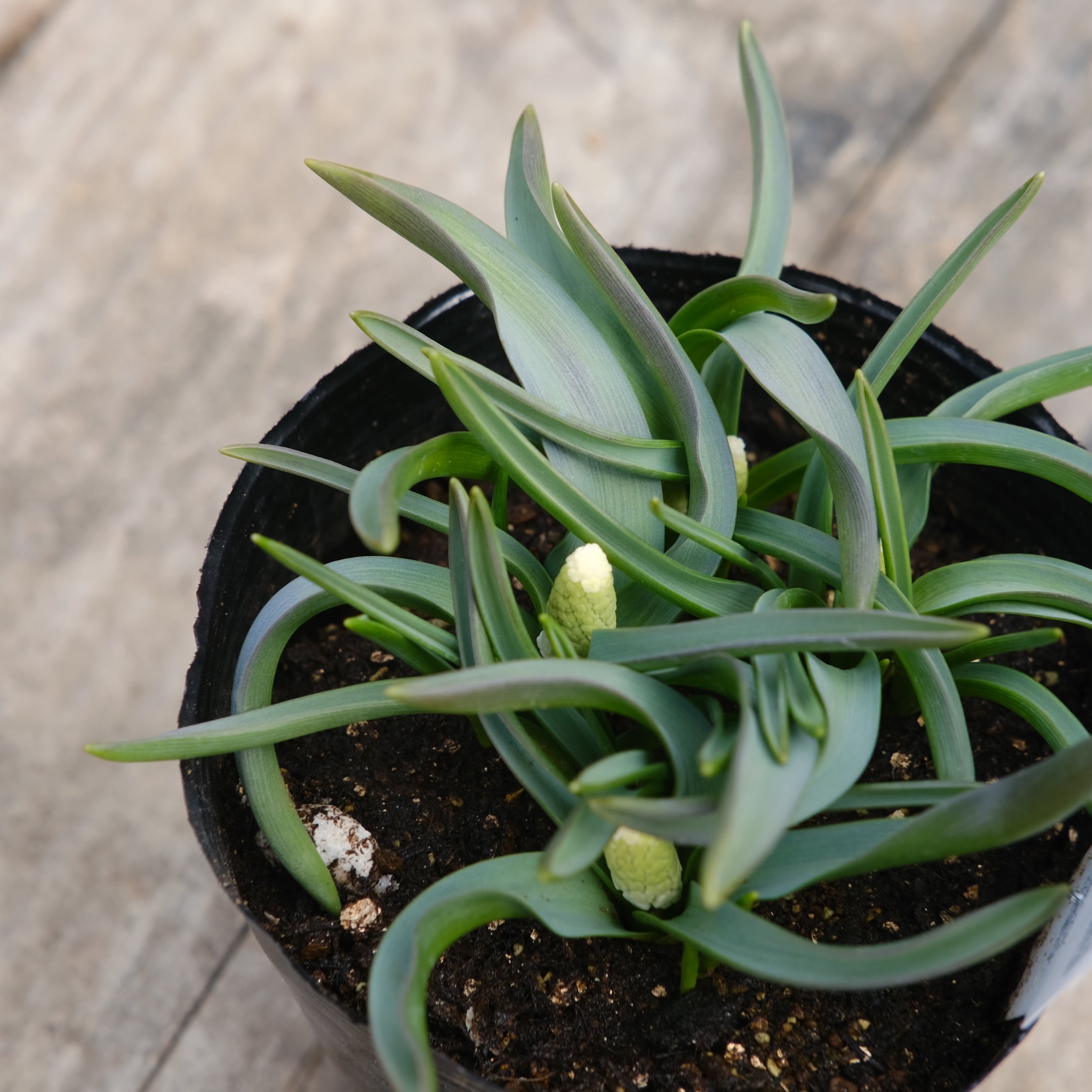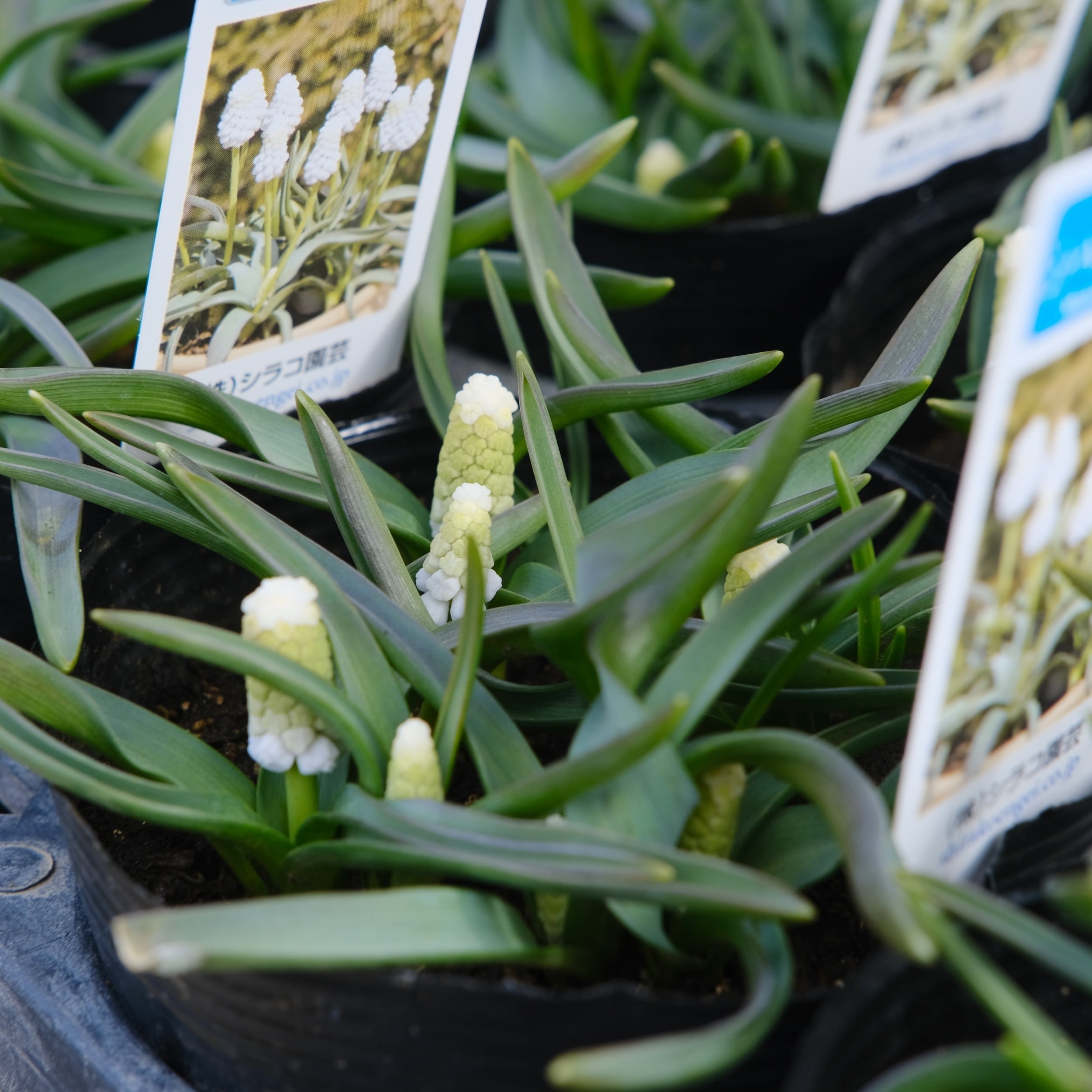 シベリアンタイガーは、淡いブルーを含んだホワイト系ムスカリ。 一般的な白系のムスカリに比べて花穂が大きく、ギュッと詰まって咲くため、非常にボリューム感があります。葉幅の広く、葉が伸びず、株立ちの良いスマートな草姿で鉢栽培に最適です。涼しい時期に良く育ちますので、3月中旬まで追肥してください。花後は花柄を摘取ります。
