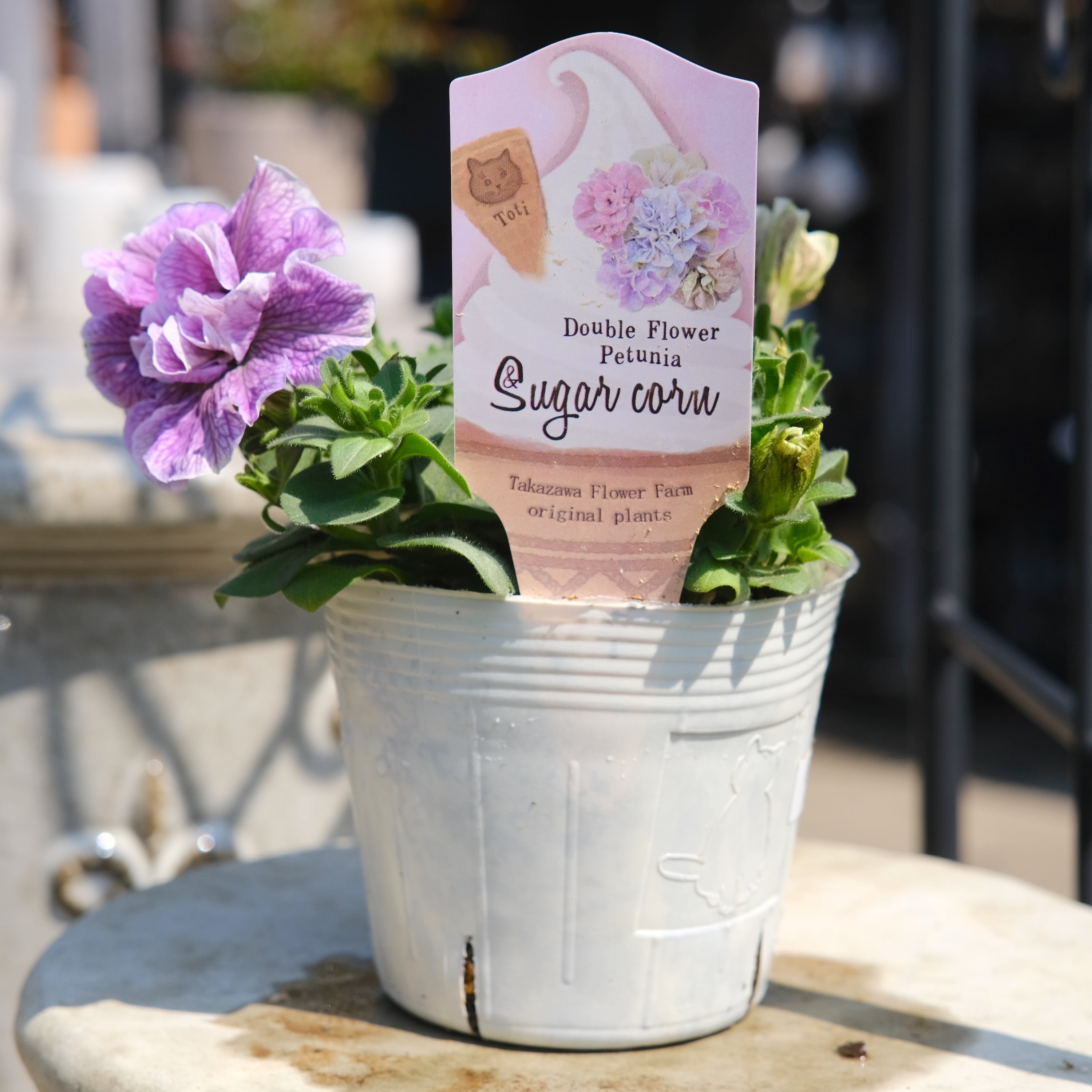 ・「アンドシュガーコーン」は、ソフトクリームに見立てたお花をシュガーコーンの器にのせて楽しむイメージで使った八重咲ペチュニアです。