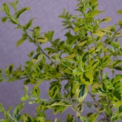 カリフォルニア ライラックの別名でも親しまれるセアノサス。こちらは斑入りの青花の品種です。小さな花が集まって5cmほどの花穂を形成し、ライラックのような樹木です。