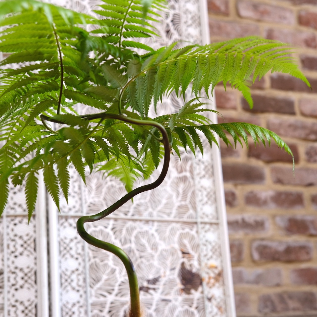 このキンコウモウは、樹肌が動物のように毛がある(ように見える)ため、ゴールデンチャウチャウ、ゴールデンモンキーなど、様々な呼び方があるようです。見た人や手に入れた人は、金運・幸運が訪れるとか...。タカワラビとも呼ばれ、新芽が出てくると、お猿さんが腕を上に上げているようにも見えます。上部の葉は、シダのような葉をしています。