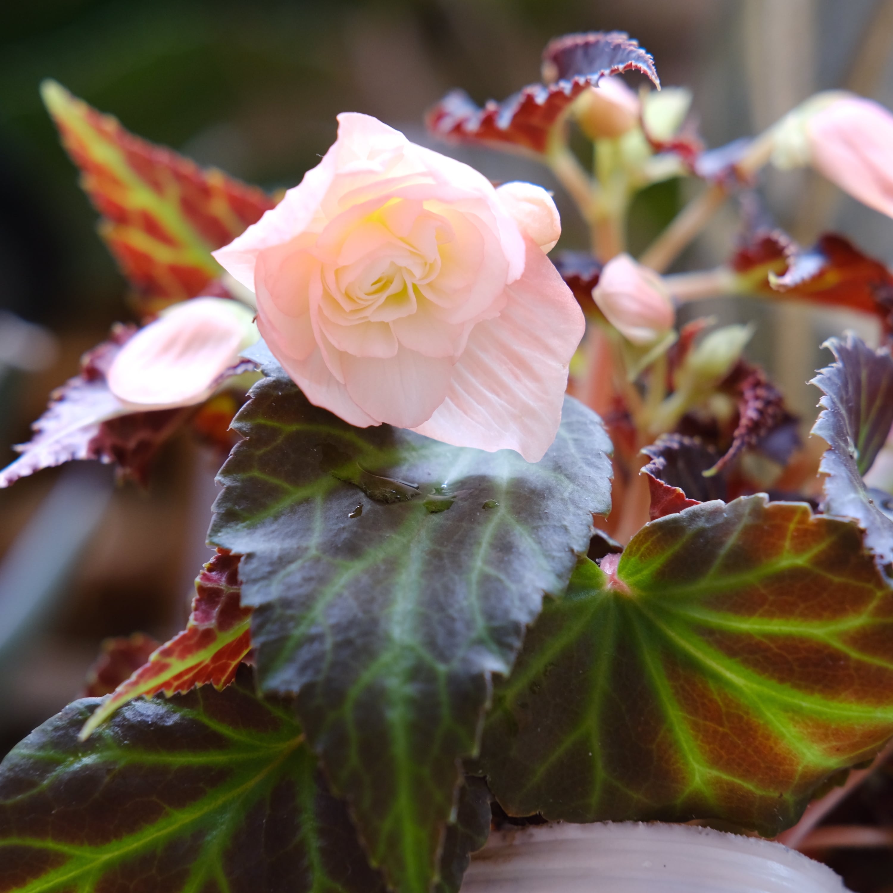 葉色がブロンズ色のベゴニアです。ぺったんこに閉じたつぼみからは想像できないような豪華な八重咲きのお花が開きます。