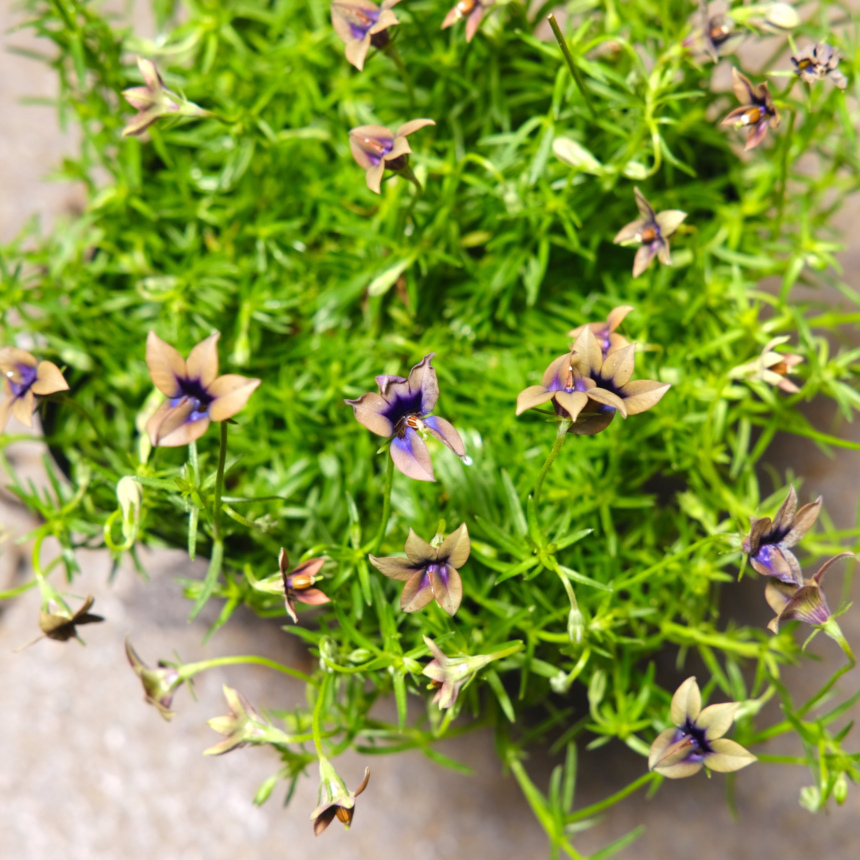 花径 1cm に満たないシックな茶色の花を次々に咲かせます。咲いた花は時間が経つにつれて、紫色がかっていきます。暑い時期には咲き休みしますが、涼しい時期になると再び咲き始めます。分枝がよくグランドカバーにもおすすめです。