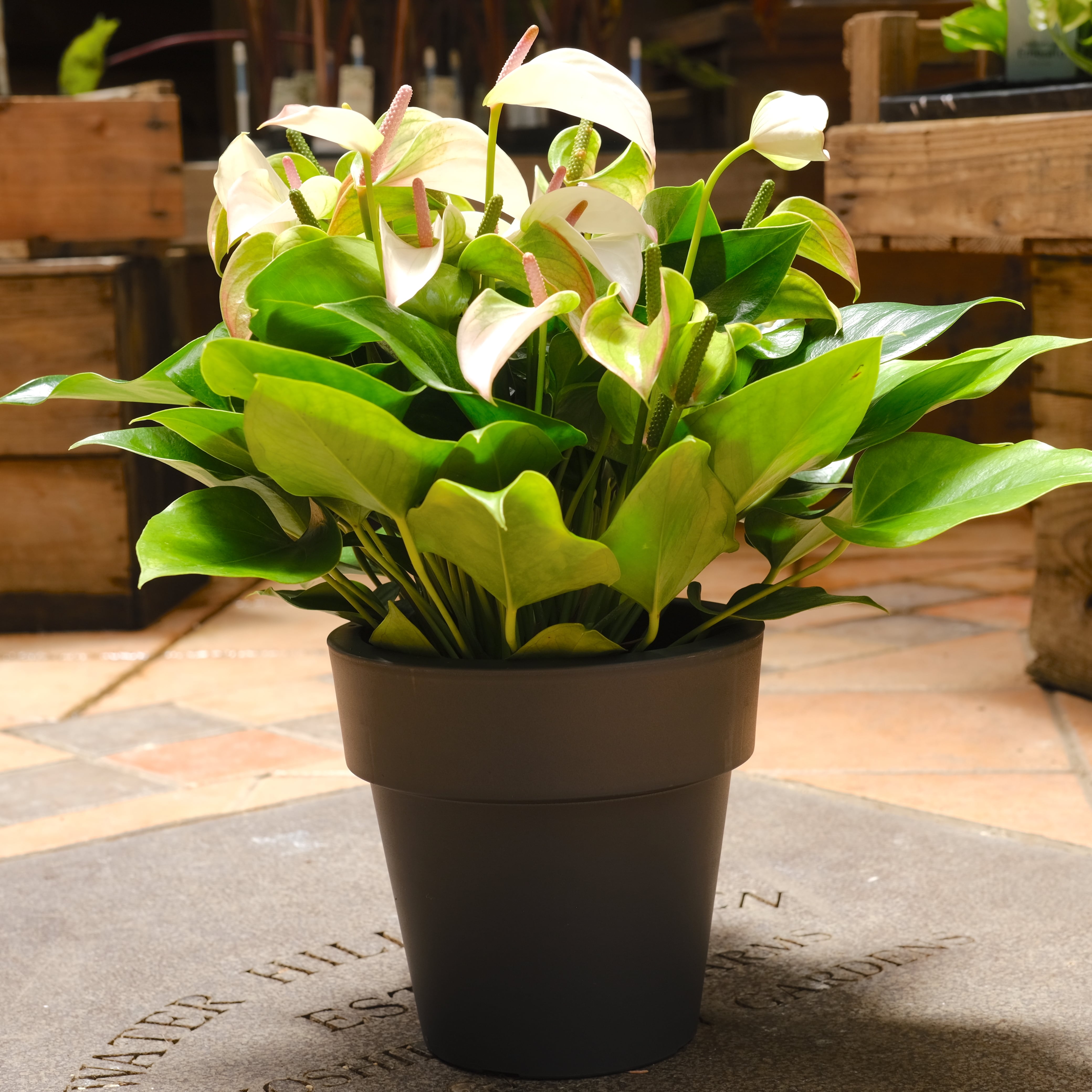 白色から淡いピンク色の上品な印象のアンスリウムです。新しい葉が一枚出る毎に花芽がひとつ付くので肥料を切らさないように育てます。室内の光の環境でも次々に花(苞葉(ほうよう))を咲かせ、1つの花が3ヶ月以上きれいな状態をキープできます。