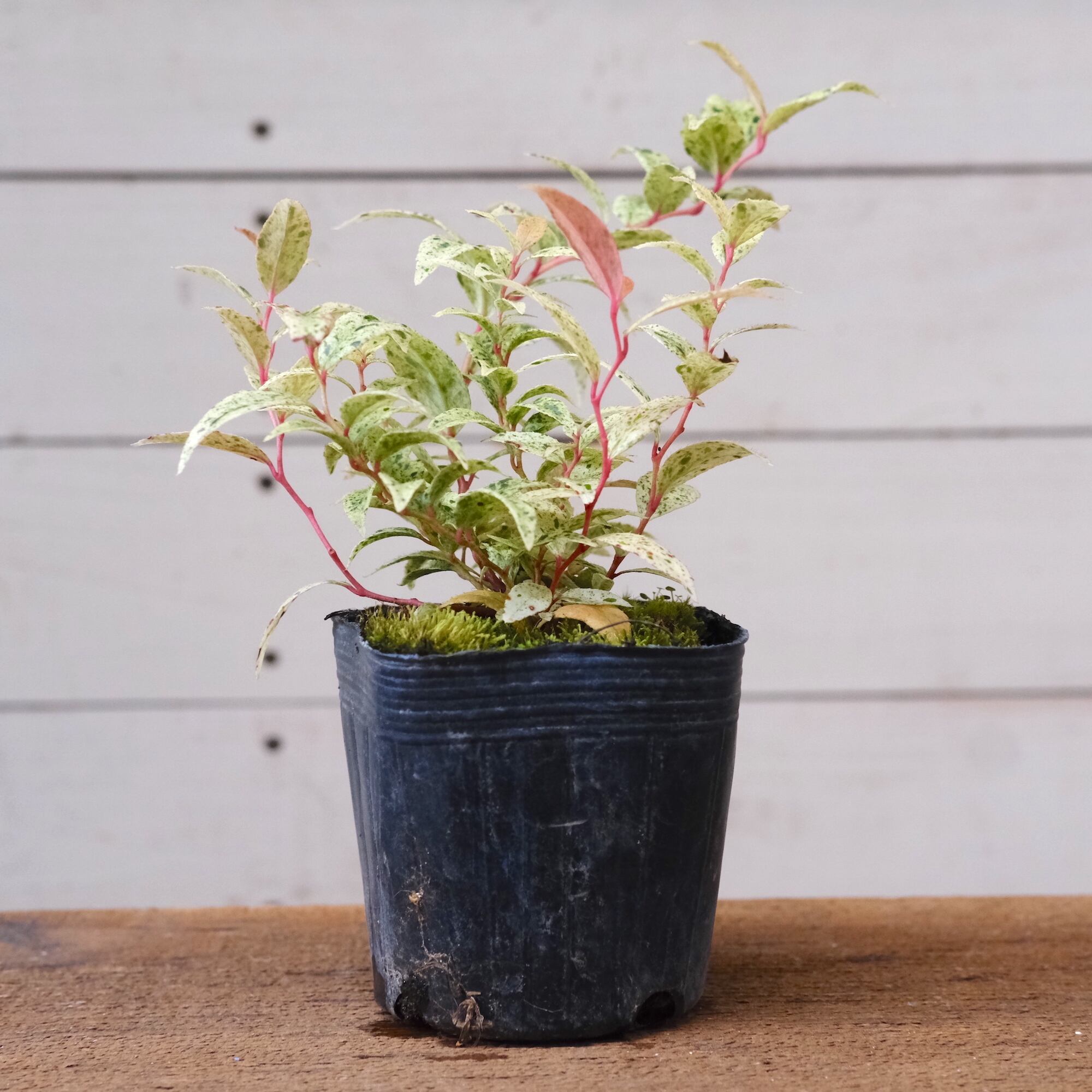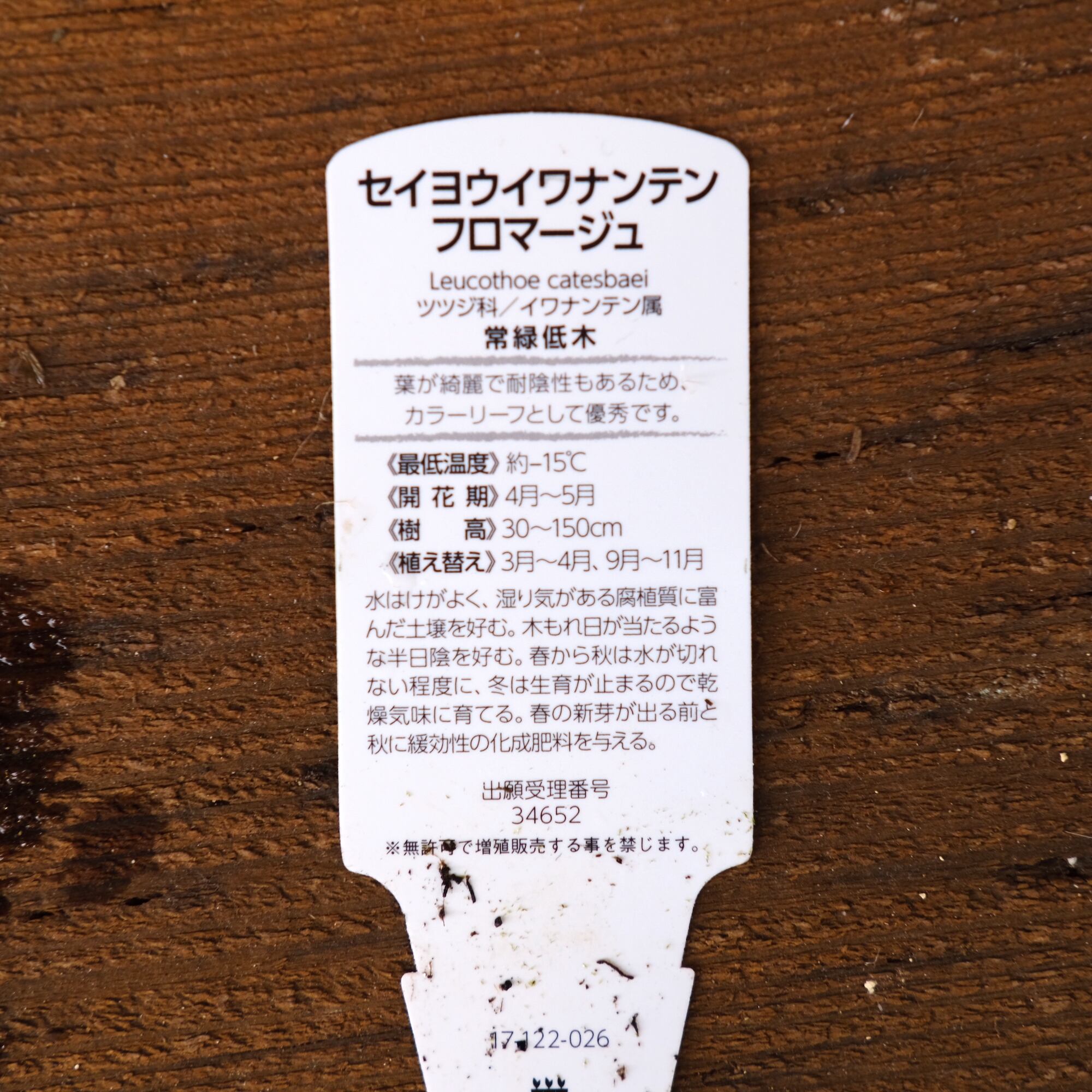 小さい葉のセイヨウイワナンテン 《 フロマージュ 》は、葉がより白い品種です。フロマージュはフランス語でチーズの意味で、その名の通りブルーチーズのような斑の入り方をします。新しい芽はほんのりと赤く色づき、その変化の過程でさまざまな表情を見せてくれます。洋風の庭にもよく似合います。強健な樹木で、耐暑性・耐寒性及び湿度に強く一年を通じて楽しめます。