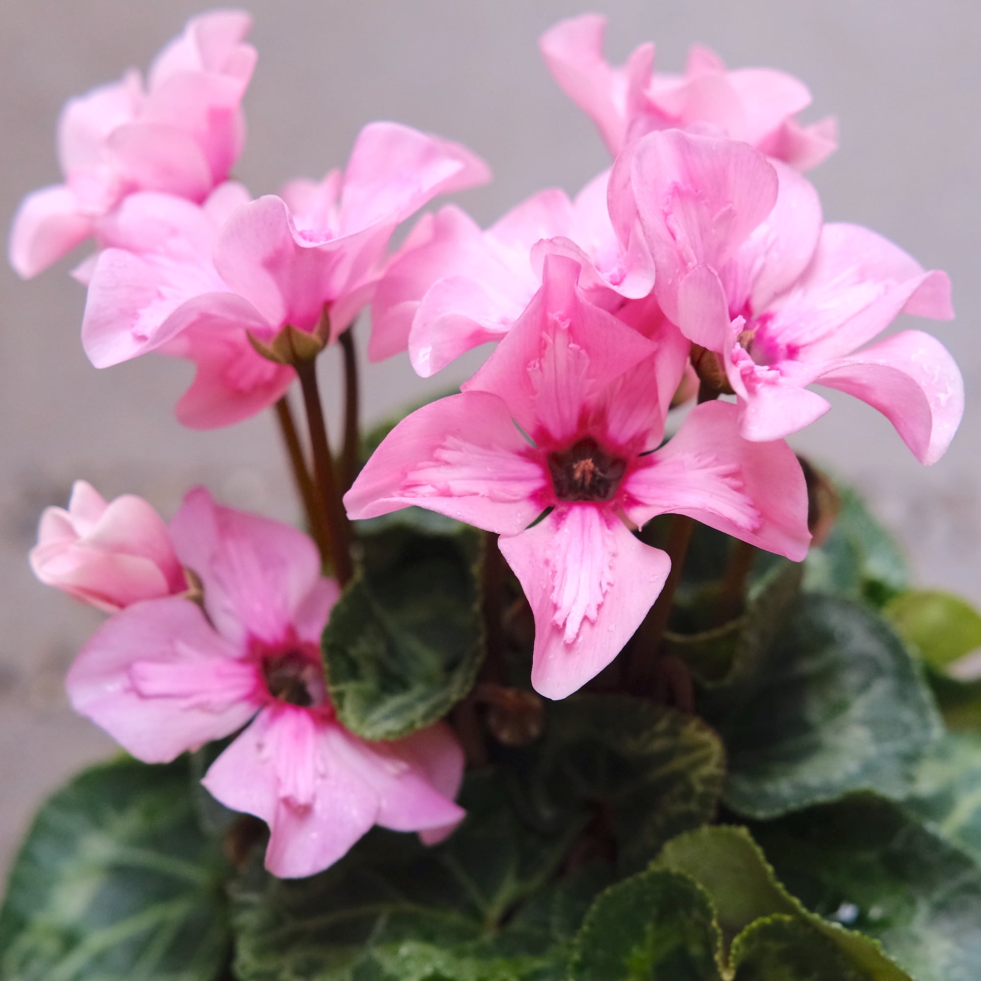 花弁の中心が羽毛状に盛り上がるクリスターターというタイプで、シクラメンには珍しい上向きに咲くユニークな品種です。花数が多く満開になるとブーケのようです。