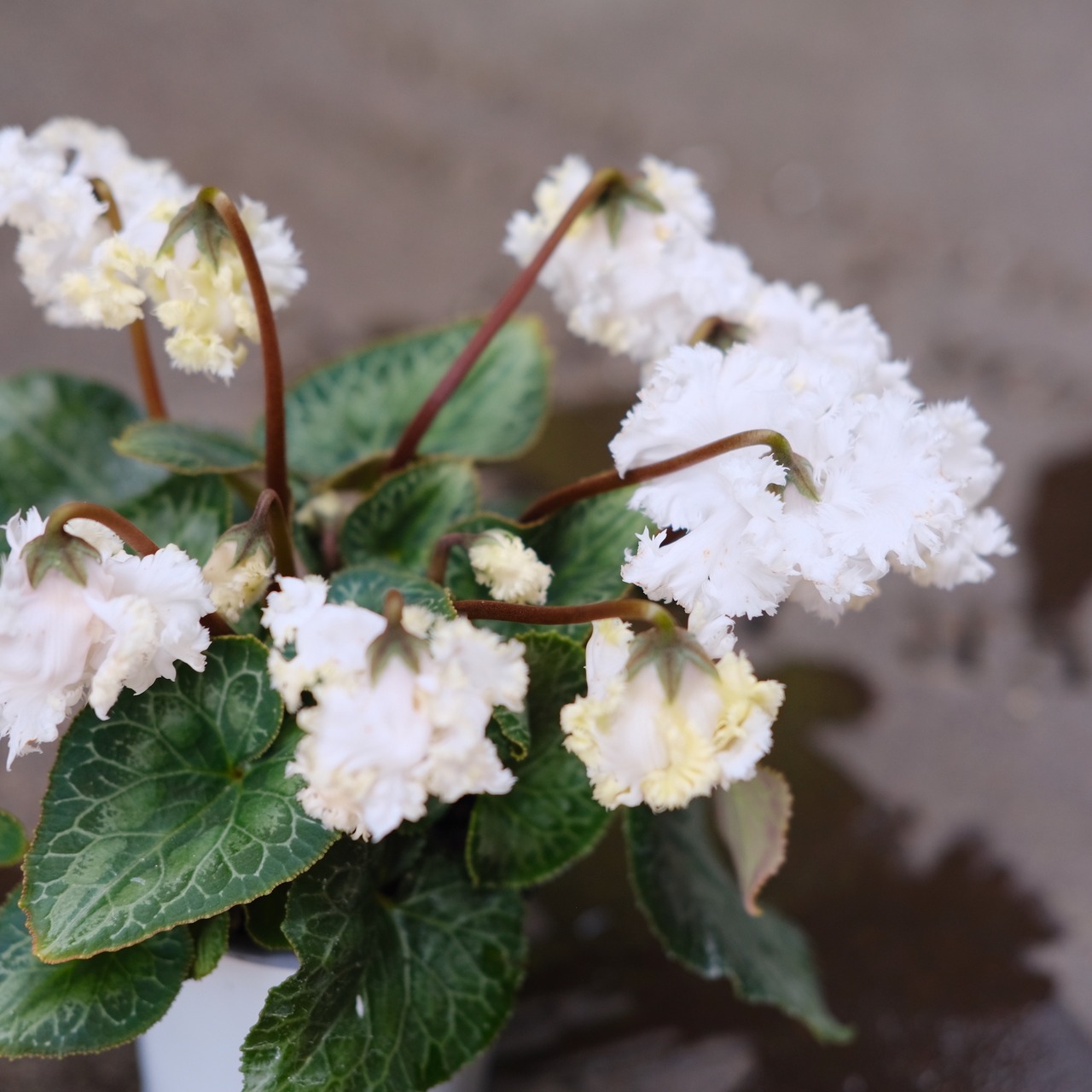 人気のスワンシリーズ。白鳥のような形をした純白の花に、ほんのり黄色みのグリーンがのってくる美しいシクラメンです。