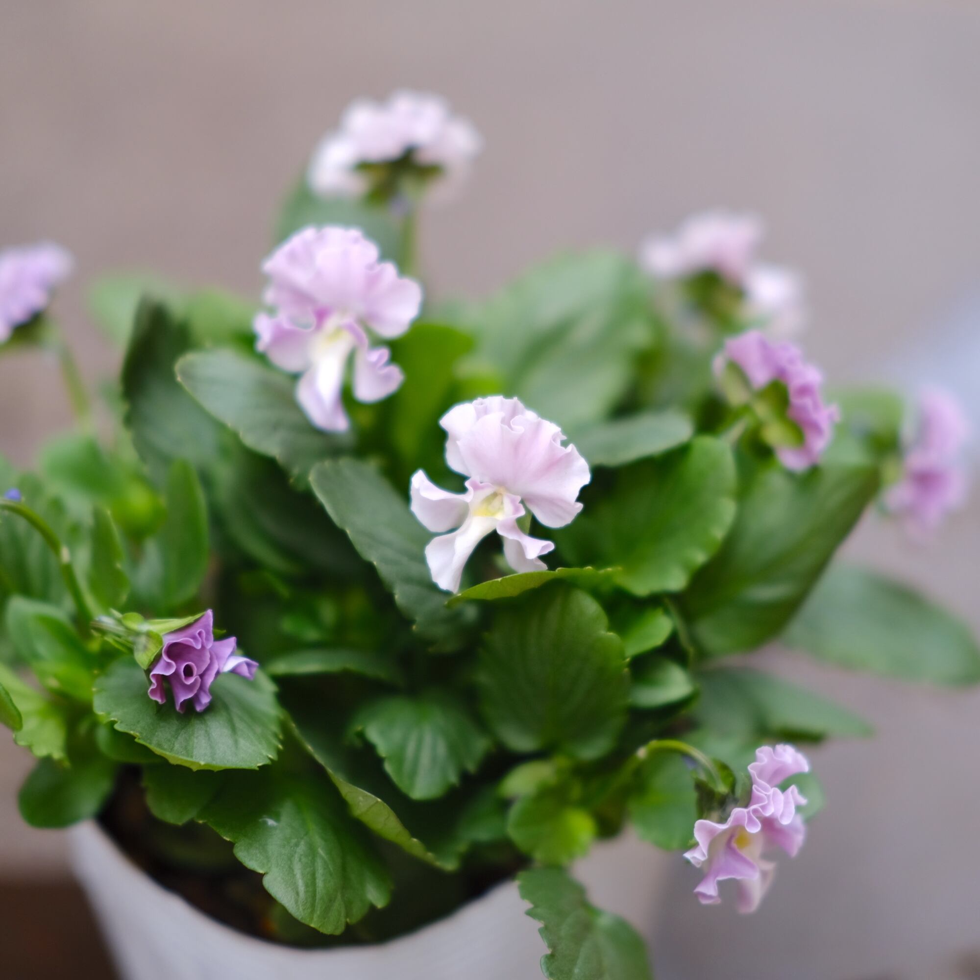 くるんとカールした花びらがゾウの鼻に見えることから、ぞうさんビオラの愛称で親しまれています。従来のぞうさんよりフリンジが強く出てとてもエレガントな仕上がりです。お花も草丈も小さめなので、コンパクトな寄せ植えはもちろん、リースづくりにもおすすめです。